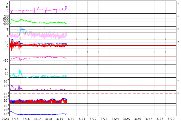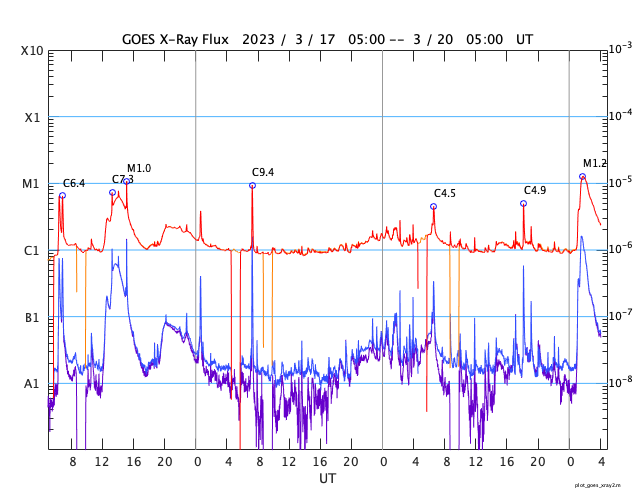 GOES衛星の太陽X線強度。赤・橙 = 0.1〜0.8 nm、青・紫 = 0.05〜0.4 nm (c) データ:NOAA/SWPC、作図:宇宙天気ニュース ![]() | |||||||||||||||||||||||||||||||||||||||||||||||||||||||||||||||||||||||||||||||||||||||||||||||||||||||||||||||||||||||||||||||||||||||||||||||||||||||||||||||||||||||||||||||||||||||||||||||||||||||||||||||||||||||||||||||||||||||||||||||||||||||