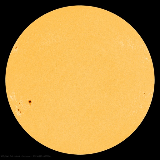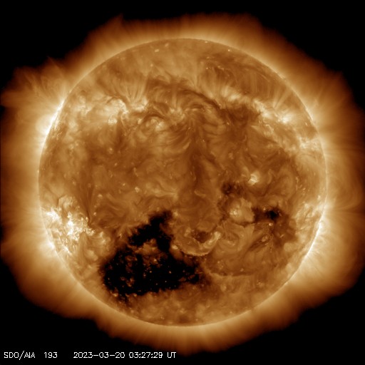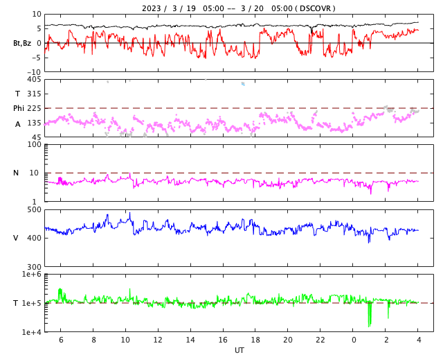 2023/ 3/20 13:11 更新 太陽風は平均的な状態です。M1.2の中規模フレアが発生しました。 担当 篠原 太陽風の速度は、430km/秒と平均的な状態が続いています。 磁場強度も6nTと平均的な値で安定しています。 磁場の南北成分は、 南北に頻繁に変化する様になっています。 磁気圏はやや活動的な状態が続き、 AE指数は、300〜700nTの小中規模の変化が 度々発生しています。 SDO衛星AIA193では、 南半球のコロナホールの先頭(右端)が 太陽の中心線に達しています。 3日後くらいから、この領域の影響で 太陽風の速度が高まる可能性があります。 太陽は、20日10時半(世界時20日1時半)に、 南東(左下)の3256黒点群でM1.2の中規模フレアが発生しました。 また、左下の3257群では、 C1〜2の小さい小規模フレアが度々発生しています。 ![]() SDO衛星のAIA193カメラによる太陽コロナの様子 (c) SDO (NASA) ![]() SDO衛星による太陽の可視光写真。マウスの矢印を写真に重ねると、黒点番号付きの写真に切り替わります。 (c) SDO (NASA) ![]() DSCOVRが観測した太陽風の磁場(黒線は全体の強度、赤線は南北成分) 磁場の向き、プラズマの密度、速度、温度 (c) データ:NOAA/SWPC、作図:宇宙天気ニュース ![]() AE指数(速報値) 下段のAEグラフの値が高くなると、オーロラ活動が活発化しています。 (c) 京都大学WDC ![]() ![]() 27日の太陽周期に合わせた図 太陽が同じ面を地球に向けていた27日前の変化から、今後を予想することができます。 (c) 作図:宇宙天気ニュース