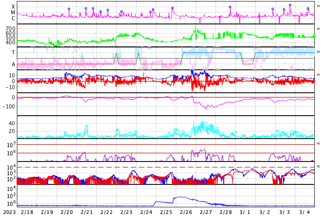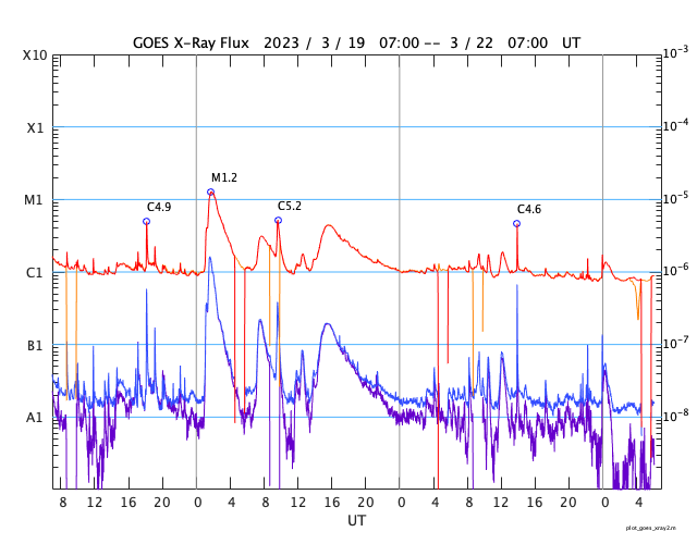 GOES衛星の太陽X線強度。赤・橙 = 0.1〜0.8 nm、青・紫 = 0.05〜0.4 nm (c) データ:NOAA/SWPC、作図:宇宙天気ニュース ![]() | ||||||||||||||||||||||||||||||||||||||||||||||||||||||||||||||||||||||||||||||||||||||||||||||||||||||||||||||||||||||||||||||||||||||||||||||||||||||||||||||||||||||||||||||||||||||||||||||||||||||||||||||||||||||||||||||||||||||||||||||||||