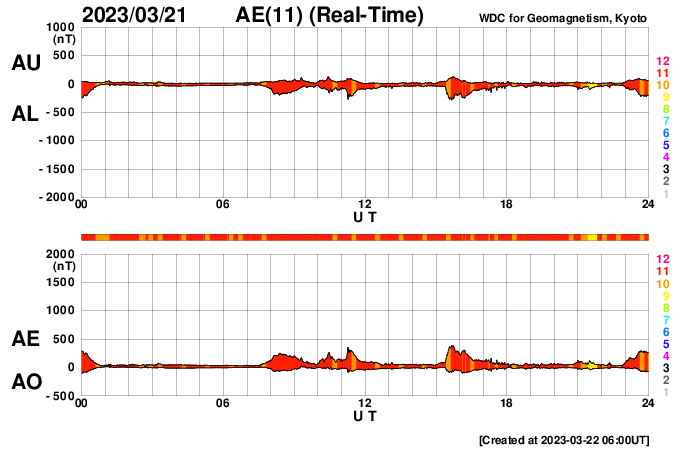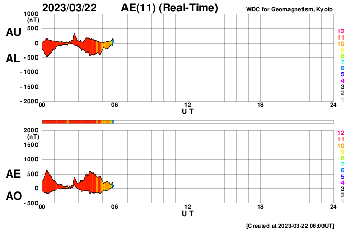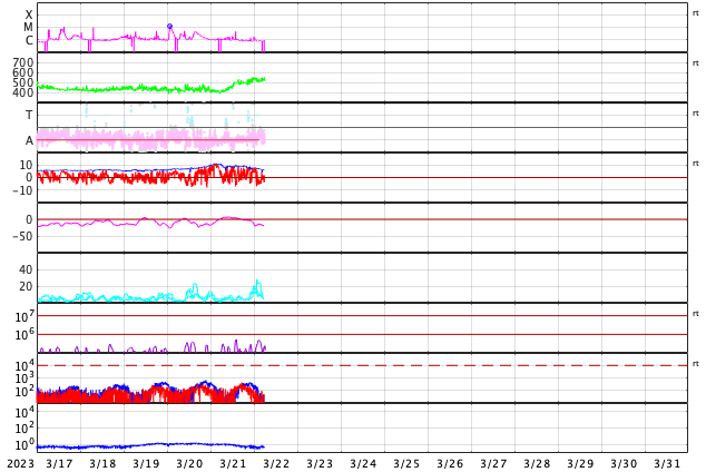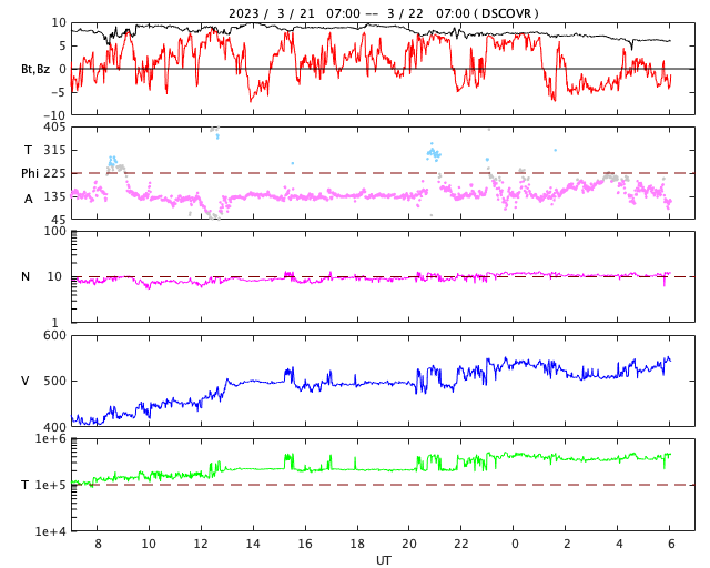 2023/ 3/22 15:11 更新 太陽風は高速になっています。太陽は穏やかです。 担当 篠原 昨日のニュース以降、太陽風の速度は上昇を始め、 夜には500km/秒と高速の状態に達しました。 現在は520km/秒で推移しています。 一方、磁場強度は10nTから6nTへ下がり、 平均的な状態に戻っています。 昨日の磁場の強まりは、 速度の高まりに先立つ変化だった様です。 磁場の南北成分は、北を向いたり、南を向いたり、 時間をおいて変化しています。 AE指数も少し時間をおいて変化が発生していて、 振幅が300nT程度から500nTへ大きくなっています。 SDO衛星AIA193の 南半球に広がっているコロナホールの影響が 始まっているのかもしれません。 その場合、速度は更に高まるでしょうか。 引き続き注目してください。 太陽は、3257黒点群でC4.6の小規模フレアが発生した程度で、 穏やかな状態です。 昨日は、ニュース更新の後も雨が続きましたが、 せっかくなので降雨の中で打ち上げを行いました。 濡れて大変ですが、楽しい活動でした。