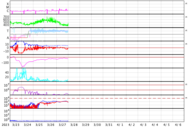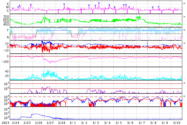 GOES衛星の太陽X線強度。赤・橙 = 0.1〜0.8 nm、青・紫 = 0.05〜0.4 nm (c) データ:NOAA/SWPC、作図:宇宙天気ニュース ![]() | |||||||||||||||||||||||||||||||||||||||||||||||||||||||||||||||||||||||||||||||||||||||||||||||||||||||||||||||||||||||||||||||||||||||||||||||||||||||||||||||||||||||||||||||||||||||||||||||||||||||||||||||||||||||||||||||||||||||||||||||||||||||||||||||||||||