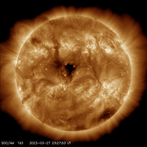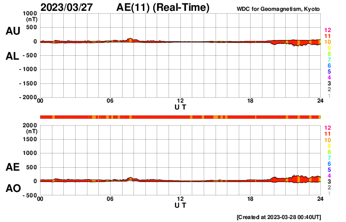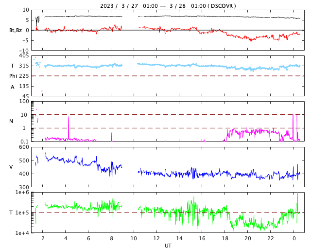 2023/ 3/28 09:44 更新 太陽風は平均的な速度に下がっています。磁気圏は穏やかです。 担当 篠原 昨日のニュースの後、太陽風の速度は低下を始め、 夜には400km/秒と平均的な速度に戻っています。 太陽風速度の高まりは、2日ほどで終わりました。 太陽風の磁場強度は、 7nTと少し強まった状態が続き、 グラフの最後に6nTへ少し下がっています。 磁場の南北成分は、 グラフの中盤まで0nT付近で推移し、 終わり頃は南寄りになっています。 磁気圏は穏やかで、 AE指数はほとんど変化のない状態が続いていますが、 磁場の南寄りに対応して、 最後に小規模の変化が発生しています。 SDO衛星AIA193の太陽コロナ写真では、 太陽の中心にコロナホールが見えています。 広がりが小さいので影響は小さいと思いますが、 3日後くらいの太陽風に変化が見られるかもしれません。 太陽は、南西(右下)の3259、3256黒点群の辺りで、 C4.6、C2.9、C3.5などの小規模フレアが続く様になっています。 (NOAA/SWPCの記録では3256群となっていますが、 3259群寄りの場所で発生している様に見えます) 3259群は黒点が少し大きくなっています。 フレアの規模も大きくなるかどうか、注目して下さい。