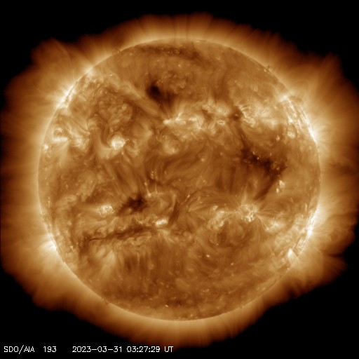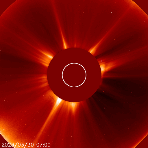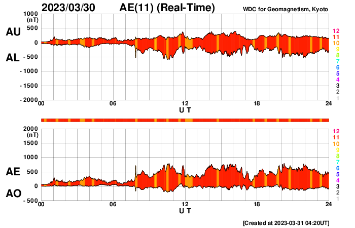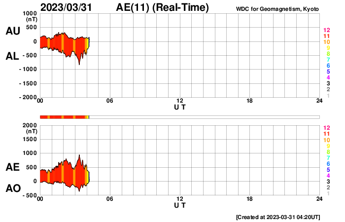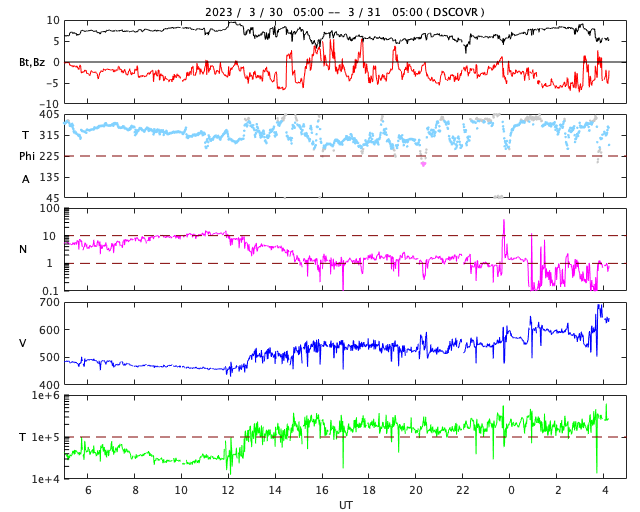 2023/ 3/31 13:24 更新 太陽風はより高速になっています。南極・昭和基地のオーロラをどうぞ。 担当 篠原 南極・昭和基地の田中良昌さんから送っていただいた、 3月23日のオーロラ写真の続きです。 昨日の3枚以上にオーロラが激しく光っている様に見えます。 1枚目の写真の左下には、 オリオン座の三つ星が斜めに並んでいます。 南半球なのでオリオン座はひっくり返っていて、 三つ星の上にオリオン大星雲のある小三つ星が縦に並んでいます。 さらに、オリオン座の右上方向、基地の建物の上の明るい星は、 おおいぬ座のシリウスです。 もちろん、おおいぬ座もひっくり返っています。 星空と対比させると、 オーロラの大きさがより実感できるのではないでしょうか。 田中さんによると、この夜は快晴で、 気温は -20℃程度とかなり寒かったそうです。 そのためカメラのバッテリーの消耗が激しく、大変だった様です。 素晴らしいオーロラをどうもありがとうございました。 太陽風は、昨夜遅くから速度が500km/秒台に高まり、 高速の状態になりました。 現在は550〜600km/秒付近で推移しています。 (現在、太陽風のデータはACE衛星の値になっています) 磁場強度は、5〜8nTあたりを上下に変化しています。 磁場の南北成分は、南寄りの傾向が続いていて、 -5nTくらいの南向きの変化が頻繁に発生しています。 このため磁気圏の活動は強まっていて、 AE指数は500〜800nTの中規模の変化が 連続的に発生しています。 コロナホールの影響が本格的にやって来た様です。 SDO衛星AIA193では、 コロナホールの広がりは比較的小さかったのですが、 高速風はどのくらい続くでしょうか。 太陽は、南西の端(右下)の3256黒点群で、 昨夕、30日16時半(世界時30日7時半)に M5.4の中規模フレアが発生しています。 SDO衛星AIA131の動画を掲載します。 このフレアに伴って、太陽の右下へ向かって CME(コロナ質量放出)が発生しています。 SOHO衛星LASCO C2、C3の動画を掲載します。 地球に対しては横向きの噴出なので、 影響はないでしょう。 3256群が沈むと、太陽は穏やかになりそうです。 ![]() 昭和基地で現地3月23日23:05(世界時23日20:05)頃に撮影されたオーロラ。 (c) 国立極地研究所 田中良昌氏 ![]() 昭和基地で現地3月23日23:30(世界時23日20:30)頃に撮影されたオーロラ。 (c) 国立極地研究所 田中良昌氏 ![]() 昭和基地で現地3月23日23:35(世界時23日20:35)頃に撮影されたオーロラ。 (c) 国立極地研究所 田中良昌氏 ![]() 南西の3256群で発生したM5.4の中規模フレア。 (c) SDO衛星AIA131 (NASA)、(動画加工 : 宇宙天気ニュース) ![]() 太陽の右下へ噴出するCME。 (c) SOHO衛星LASCO C2、C3 (ESA & NASA)、(動画加工 : 宇宙天気ニュース) ![]() SDO衛星のAIA193カメラによる太陽コロナの様子 (c) SDO (NASA) ![]() SDO衛星による太陽の可視光写真。マウスの矢印を写真に重ねると、黒点番号付きの写真に切り替わります。 (c) SDO (NASA) ![]() DSCOVRが観測した太陽風の磁場(黒線は全体の強度、赤線は南北成分) 磁場の向き、プラズマの密度、速度、温度 (c) データ:NOAA/SWPC、作図:宇宙天気ニュース ![]() AE指数(速報値) 下段のAEグラフの値が高くなると、オーロラ活動が活発化しています。 (c) 京都大学WDC ![]() ![]() 27日の太陽周期に合わせた図 太陽が同じ面を地球に向けていた27日前の変化から、今後を予想することができます。 (c) 作図:宇宙天気ニュース