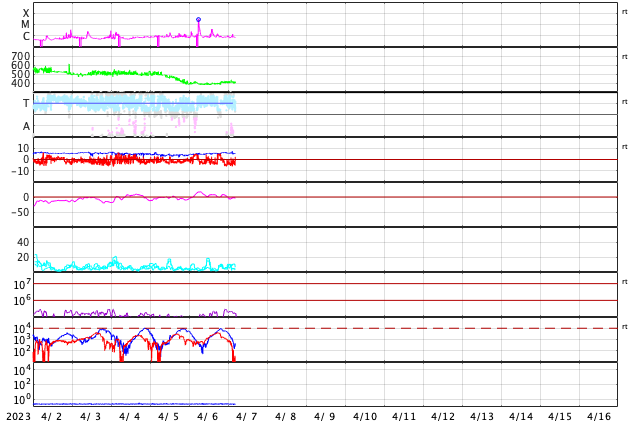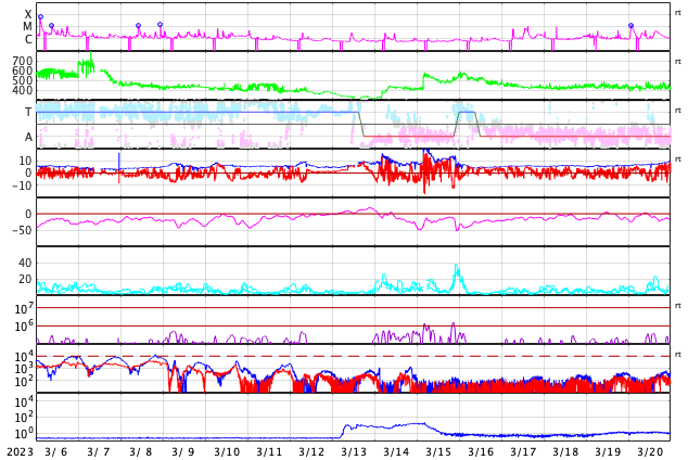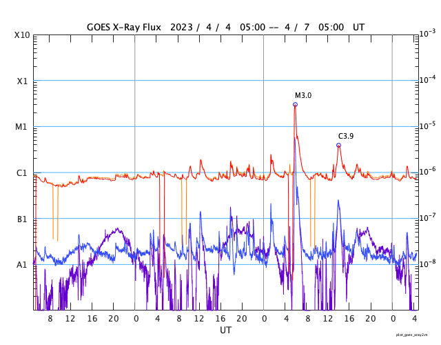 GOES衛星の太陽X線強度。赤・橙 = 0.1〜0.8 nm、青・紫 = 0.05〜0.4 nm (c) データ:NOAA/SWPC、作図:宇宙天気ニュース ![]() | ||||||||||||||||||||||||||||||||||||||||||||||||||||||||||||||||||||||||||||||||||||||||||||||||||||||||||||||||||||||||||||||||||||||||||||||||||||||||||||||||||||||||||||||||||||||||||||||||||||||||||||||||||||||||||||||||