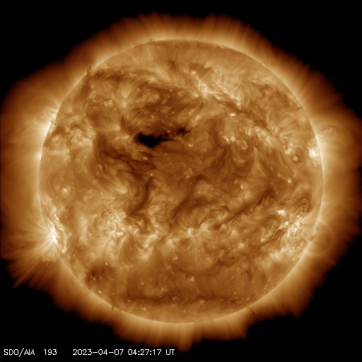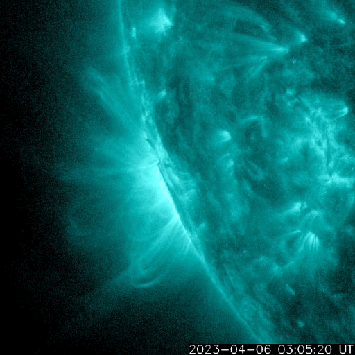 2023/ 4/ 7 13:47 更新 太陽風は平均的な速度が続いています。M3.0の中規模フレアが発生しました。 担当 篠原 太陽風の速度は、390km/秒から410km/秒へ 小さく上がる変化が見える程度で、 平均的な状態が続いています。 磁場強度も、5〜6nTと平均的な値で安定しています。 磁場の南北成分は、 昨日のニュースの後に南向きに戻り、 以降、南寄りの傾向が続いています。 磁気圏の活動も少し高まった状態になっていて、 AE指数は500nT程度の中規模の変化が 数時間おきに発生しています。 SDO衛星AIA193の太陽コロナ写真では、 中心部の北側(上側)に小さいコロナホールが見えています。 広がりが小さいので影響は小さくなりそうですが、 3日後くらいの太陽風に変化が見られるでしょうか。 太陽は、南東の端(左下)に現れた黒点に、 3272群と番号が付けられています。 この領域で、昨日の午後、 6日14時半(世界時5日5時半)に、 M3.0の中規模フレアが発生しました。 SDO衛星AIA131の動画を掲載します。 その後は目立った活動を起こしていません。 また、南西(右下)の3270群の南側で C3.9の小規模フレアが発生しています。