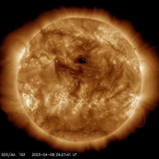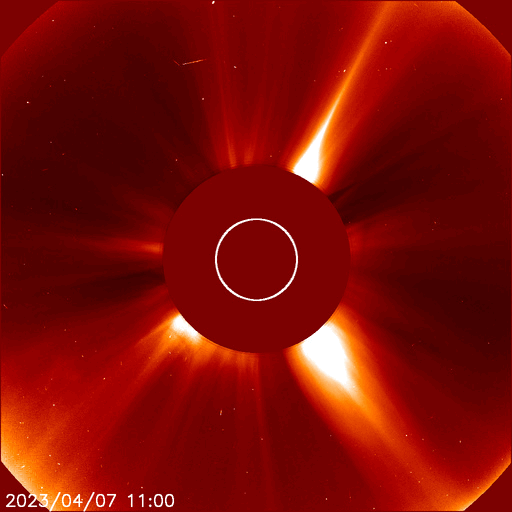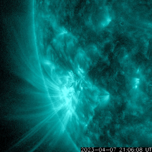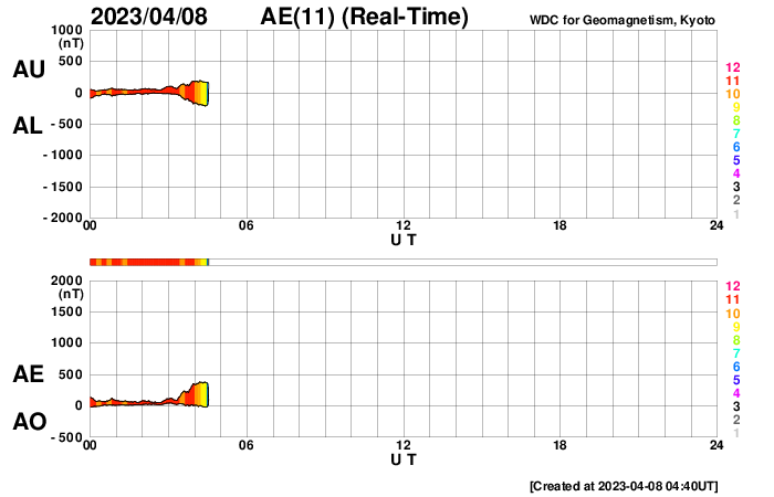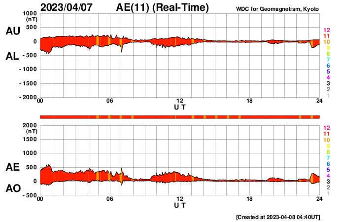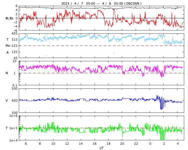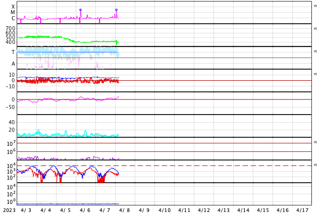 2023/ 4/ 8 13:55 更新 太陽風は平均的な状態が続いています。磁気圏は比較的穏やかです。 担当 篠原 太陽風は、速度は400km/秒、磁場強度は5nTと、 どちらも平均的な状態で安定しています。 磁場の南北成分は比較的南寄りになっていて、 AE指数は、300nTくらいの小規模の変化が 時々発生しています。 全体としては比較的穏やかです。 SDO衛星AIA193では、 太陽の中心部の北側に淡いコロナホールが見えています。 3日後くらいに弱い影響がやって来るでしょうか。 太陽の南東(左下)の3272黒点群は、 昨日のニュース以降は C1〜2の小さいフレアを起こす程度だったのですが、 今朝、8日5時半(世界時7日23時半)に C5.8と少し大きい小規模フレア、 続いて、8日10時半(世界時8日1時半)に M2.9の中規模フレアが発生しています。 SDO衛星AIA131の動画を掲載します。 この後も活動は続くでしょうか。 また、昨夕、7日17時(世界時7日8時)頃に、 中心部の南側(下側)で弱い爆発現象が発生しました。 SDO衛星AIA193の動画を掲載します。 これにより、太陽の下寄りに広がる 淡いCME(コロナ質量放出)が発生しています。 発生場所が中心に近いので、 太陽風磁場の強まりなどの影響が 地球へやって来るかもしれません。