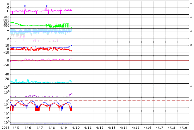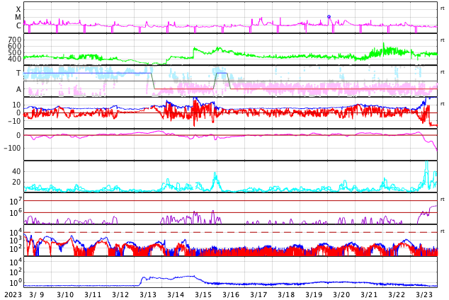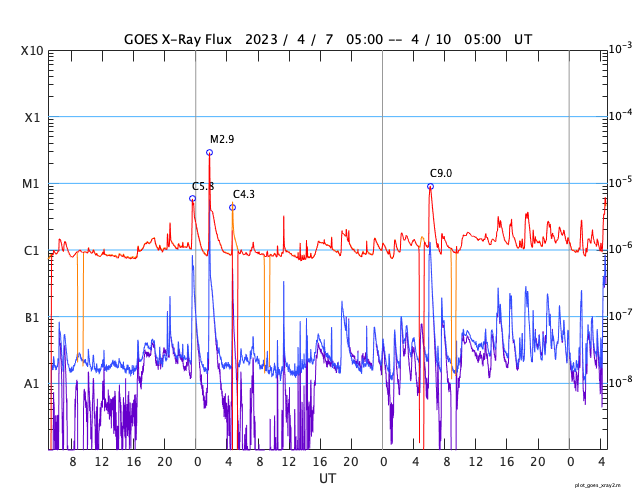 GOES衛星の太陽X線強度。赤・橙 = 0.1〜0.8 nm、青・紫 = 0.05〜0.4 nm (c) データ:NOAA/SWPC、作図:宇宙天気ニュース ![]() | |||||||||||||||||||||||||||||||||||||||||||||||||||||||||||||||||||||||||||||||||||||||||||||||||||||||||||||||||||||||||||||||||||||||||||||||||||||||||||||||||||||||||||||||||||||||||||||||||||||||||||||||||||||||||||||||||||||||||||||||||||||||||