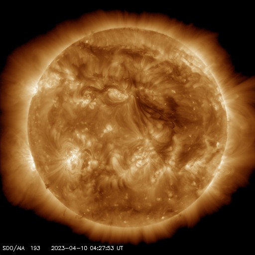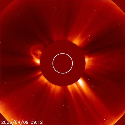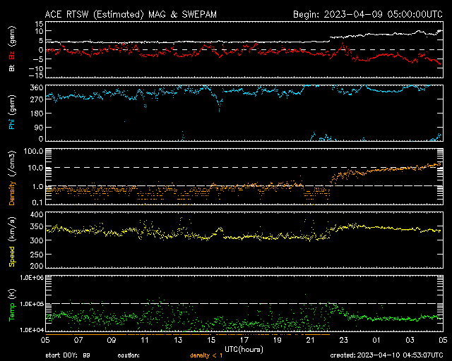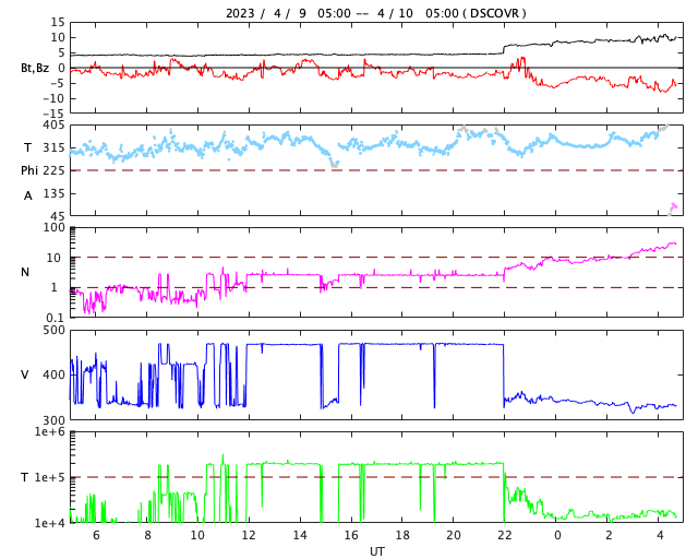 2023/ 4/10 13:54 更新 太陽風の弱い乱れが到来しています。速度は低速の状態です。 担当 篠原 今朝、10日7時(世界時9日22時)頃に、 太陽の弱い乱れが到来して、 磁場強度が4nTから8nTへ、 速度は300km/秒から350km/秒程度へ それぞれ小幅の変化をしています。 今日は、DSCOVR衛星のデータが途中まで乱れているので、 ACE衛星のデータも掲載します。 現在は、磁場強度は10nTへ強まっていますが、 速度は330km/秒と少し下がっています。 速度は低速の状態が続いています。 8日のニュースで、 7日夕方に発生したCME(コロナ質量放出)を紹介しましたが、 この影響と考えると、到来まで2日半となります。 300km/秒台と低速であることをを考えると、 到来までの時間が短い様に感じます。 太陽風磁場の南北成分は、 乱れの到来以降、南向きに強まっていて、 -5nT前後の変化になっています。 しかし、速度が下がっているため、 磁気圏への影響は限定的で、 AE指数は、グラフの最後で500nTに達する程度の変化です。 太陽は、昨夜、9日19時(世界時9日10時)頃に、 西の端(右端)でCMEが発生しています。 SOHO衛星LASCO C2、C3の動画を掲載します。 SDO衛星では、対応する変化が見られなかったので、 太陽の向こう側で発生した現象ではないかと思います。 また、南東(左下)の3272群で、 昨日の午後、9日15時(世界時9日6時)に、 C9.0と大きい小規模フレアが発生しました。 3272群では、以降もCクラスの小規模フレアが続いています。 中心部の北東側(左上)には新しい黒点が発生して、 3273群と番号が付けられています。 C2.4、C2.0、C2.8などの小規模フレアが発生しています。 南東の端でも活動が続いています。 可視光写真では、黒点が見え始めた様です。 ![]() 太陽の右に向かって噴出するCME。 (c) SOHO衛星LASCO C2、C3 (ESA & NASA)、(動画加工 : 宇宙天気ニュース) ![]() SDO衛星のAIA193カメラによる太陽コロナの様子 (c) SDO (NASA) ![]() SDO衛星による太陽の可視光写真。マウスの矢印を写真に重ねると、黒点番号付きの写真に切り替わります。 (c) SDO (NASA) ![]() DSCOVRが観測した太陽風の磁場(黒線は全体の強度、赤線は南北成分) 磁場の向き、プラズマの密度、速度、温度 (c) データ:NOAA/SWPC、作図:宇宙天気ニュース ![]() ACEが観測した太陽風の磁場(1番上の枠、白線は全体の強度、赤線は南北成分) および、太陽風の密度(3番目の橙線)、速度(4番目の黄線) (c) NOAA/SWPC ![]() AE指数(速報値) 下段のAEグラフの値が高くなると、オーロラ活動が活発化しています。 (c) 京都大学WDC ![]() ![]() 27日の太陽周期に合わせた図 太陽が同じ面を地球に向けていた27日前の変化から、今後を予想することができます。 (c) 作図:宇宙天気ニュース