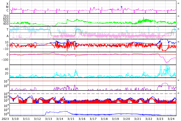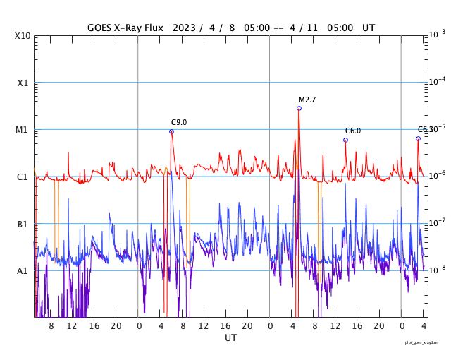 GOES衛星の太陽X線強度。赤・橙 = 0.1〜0.8 nm、青・紫 = 0.05〜0.4 nm (c) データ:NOAA/SWPC、作図:宇宙天気ニュース ![]() | ||||||||||||||||||||||||||||||||||||||||||||||||||||||||||||||||||||||||||||||||||||||||||||||||||||||||||||||||||||||||||||||||||||||||||||||||||||||||||||||||||||||||||||||||||||||||||||||||||||||||||||||||||||||||||||||||||||||||||||||||||||||||||||||||||||||||||||||||||||||