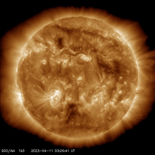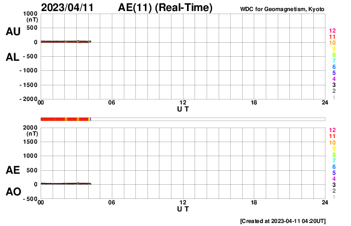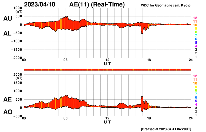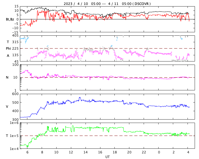 2023/ 4/11 13:29 更新 一時的に太陽風が高速になりました。現在は平均的な状態に戻りかけています。 担当 篠原 太陽風は、昨日の夕方頃から速度が高まり、 500km/秒と高速の状態になりました。 今朝くらいから少し下がって、 現在は450km/秒と速度の高まりは終わりかけています。 SDO衛星AIA193で北半球側に見えていた 小さいコロナホールの影響がやって来たのでしょうか。 広がりが小さかったので、 影響も短時間で終わろうとしているのかもしれません。 現在のSDO衛星AIA193の太陽コロナ写真では、 中心部に目立ったコロナホールはなく、 太陽風は穏やかに推移しそうです。 磁気圏は穏やかです。 AE指数は、グラフの後半は変化がなくなっています。 太陽は、昨日のニュースの直後、 10日14時(世界時10日5時)に、 南東の端(左下)の3276黒点群で M2.8の中規模フレアが発生しました。 3276群はこの後も、C1〜3と規模は小さいですが、 フレアの活動が続いています。 また、中心部南東側の3272群も、 C6.0とC6.3、そしてC1〜3の小規模フレアが多く発生しています。 この後も活動の様子に注目してください。