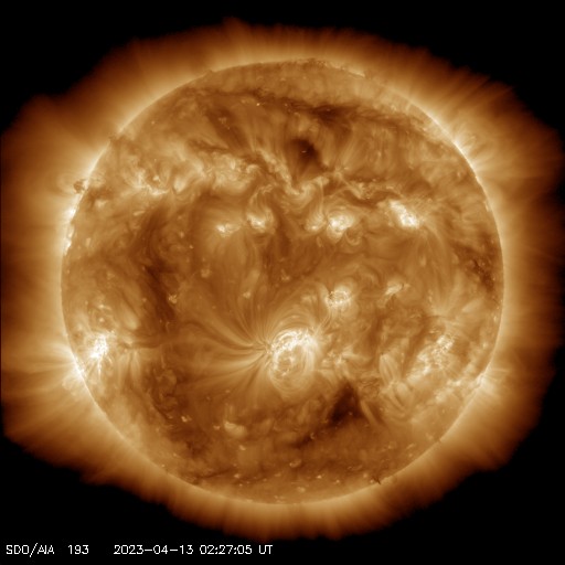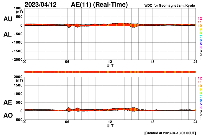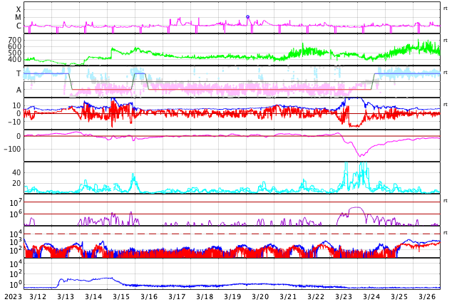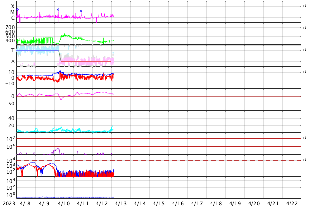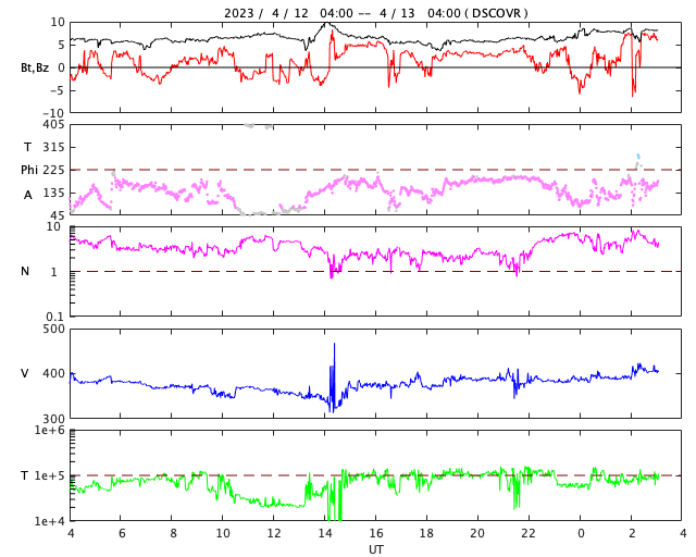 2023/ 4/13 12:19 更新 太陽風は平均的な速度になっています。磁気圏は穏やかです。 担当 篠原 太陽風の速度は、 昨夜遅くにかけて350km/秒まで下がりましたが、 その後ゆっくりと上がって、 現在は400km/秒と平均的な速さに戻っています。 磁場強度は、5nTと平均的な状態から、 グラフの最後は8nTに少し強まっています。 磁場の南北成分は、北寄りの傾向が続いています。 磁気圏は穏やかで、AE指数はほとんど変化がありません。 SDO衛星AIA193では、太陽の中心部にコロナホールはなく、 太陽風は穏やかに推移しそうです。 太陽は、南東の端(左下)の黒点に3279群と新しい番号が付けられ、 その領域で、C6.1、C4.8などの小規模フレアが発生しています。 X線グラフには、C5.2の小規模フレアもありますが、 これは、南東の端の少し向こう側で発生した様です。 可視光写真では、黒点が見え始めています。
