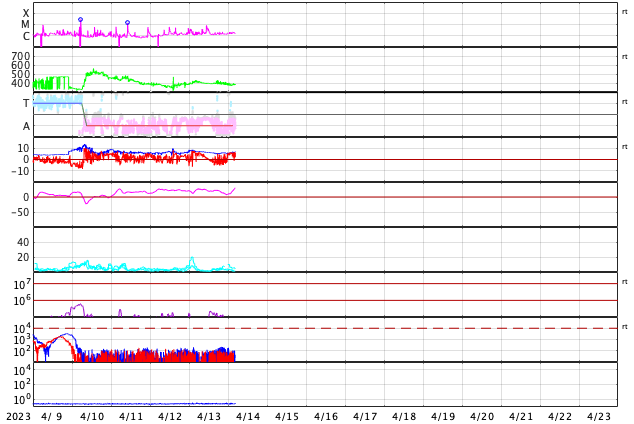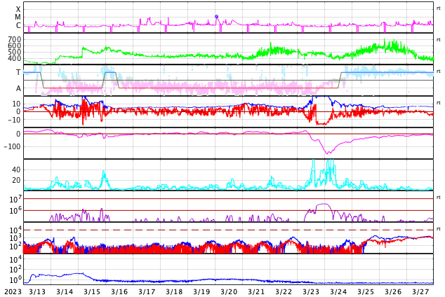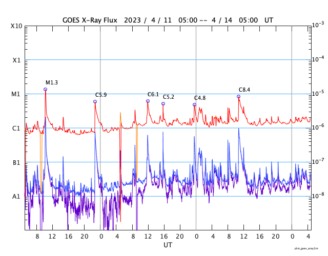 GOES衛星の太陽X線強度。赤・橙 = 0.1〜0.8 nm、青・紫 = 0.05〜0.4 nm (c) データ:NOAA/SWPC、作図:宇宙天気ニュース ![]() | ||||||||||||||||||||||||||||||||||||||||||||||||||||||||||||||||||||||||||||||||||||||||||||||||||||||||||||||||||||||||||||||||||||||||||||||||||||||||||||||||||||||||||||||||||||||||||||||||||||||||||||||||||||||||||||||||||||||||||||||||||||||||||||||||||||||||