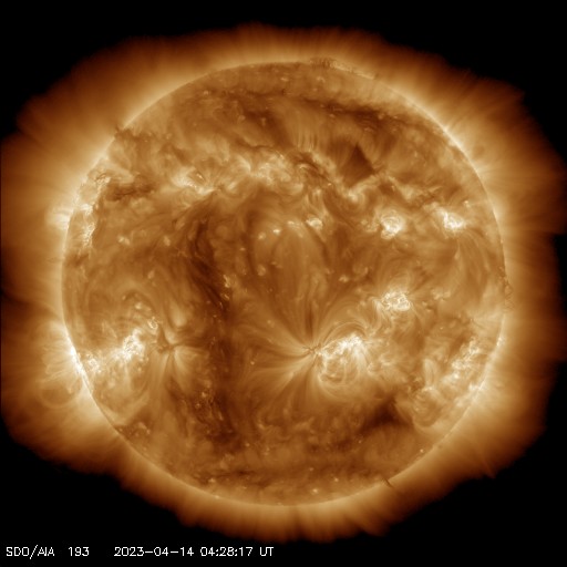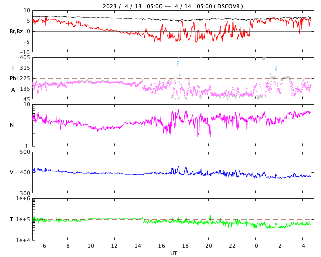 2023/ 4/14 13:58 更新 太陽風はやや低速になっています。黒点が次第に増えています。 担当 篠原 太陽風の速度は、400km/秒から380km/秒へ少し下がり、 やや低速になっています。 磁場強度は、6〜7nTで安定しています。 磁気圏は穏やかで、 AE指数は、グラフの途中で300nTの小規模の変化が起きている程度で、 以降は変化がなくなっています。 SDO衛星AIA193では、中心部の南東側(左下)で 淡いコロナホールが縦に伸びている様に見えます。 4〜5日後くらいに影響がやって来るかもしれません。 太陽は、この数日で可視光写真がだいぶにぎやかになっています。 今日の写真では、群番号が7か所と、 番号のない黒点も2か所に見えています。 フレアは、中心部南西側(右下)の3272群でC8.4、 南東の3279群でC6.7、C4.3 などの小規模フレアが発生しています。 活動としては特に高まってはいませんが、 黒点が増えると活動が高まる可能性も出てくるので、 注目は続けて下さい。 ![]() SDO衛星のAIA193カメラによる太陽コロナの様子 (c) SDO (NASA) ![]() SDO衛星による太陽の可視光写真。マウスの矢印を写真に重ねると、黒点番号付きの写真に切り替わります。 (c) SDO (NASA) ![]() DSCOVRが観測した太陽風の磁場(黒線は全体の強度、赤線は南北成分) 磁場の向き、プラズマの密度、速度、温度 (c) データ:NOAA/SWPC、作図:宇宙天気ニュース ![]() AE指数(速報値) 下段のAEグラフの値が高くなると、オーロラ活動が活発化しています。 (c) 京都大学WDC ![]() ![]() 27日の太陽周期に合わせた図 太陽が同じ面を地球に向けていた27日前の変化から、今後を予想することができます。 (c) 作図:宇宙天気ニュース
