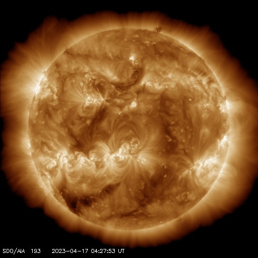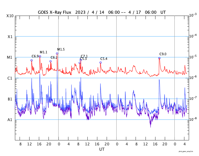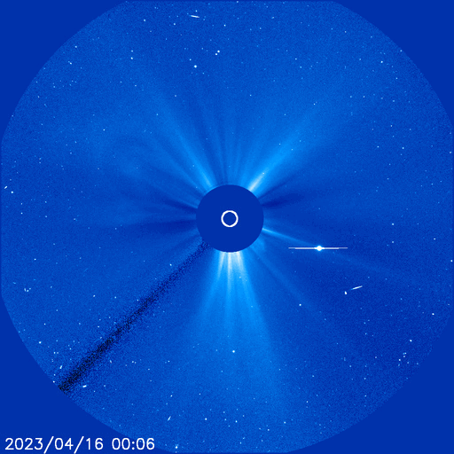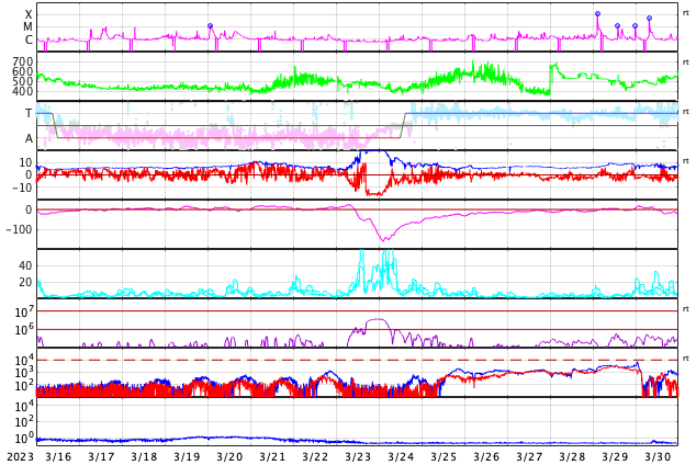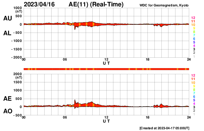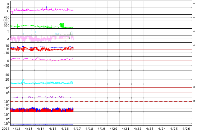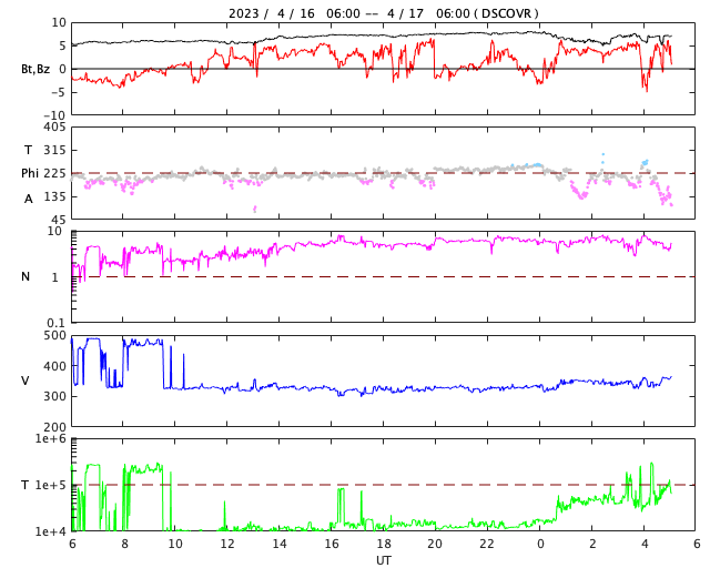 2023/ 4/17 14:17 更新 太陽風は低速で、磁気圏も穏やかです。オーロラとFalcon 9の渦巻きの続きをどうぞ。 担当 篠原 アラスカ・フェアバンクスの今野さんよりいただいた、 現地15日1時50分(世界時15日18時50分)頃に撮影された、 オーロラとFalcon 9による渦巻きの続き、後半の3枚です。 今日の2枚目の写真では、 渦巻きの下にカシオペヤ座のWが見えています。 昨日の1、2枚目と比べると、渦の動きが分かります。 また、この3枚は同じ条件で撮影されている様なので、 移動の間に渦がこれだけ淡くなっていた様です。 そして、今日の3枚目では渦のすぐ上に北斗七星が見えています。 天頂に近付いた頃の撮影の様です。 spaceweather.com でもこの渦が紹介されていました。 全天カメラによる動画も掲載されていて、 すごい光景になっています。 本当に素晴らしい写真をありがとうございました。 昨日紹介した、SOHO衛星LASCO C2による CME(コロナ質量放出)の動画の続きを、 LASCO C3で紹介します。 かなり淡くて見にくいですが、 ハロー型に近い状態でガスが広がっている様に見えます。 太陽風の乱れは到来するでしょうか。 太陽は、北東の端(左上)の向こう側で C9.0と大きい小規模フレアが発生しています。 今後、どの様な領域が現れるでしょうか。 太陽風は、330〜350km/秒と低速の風が続いています。 磁場強度は7〜8nTと少し強い状態です。 磁場の南北成分は北寄りに変わっていて、 磁気圏は穏やかです。 AE指数は、変化が見られなくなっています。