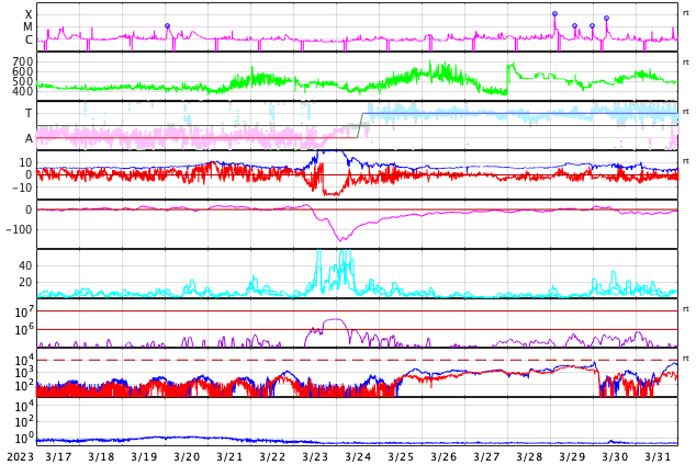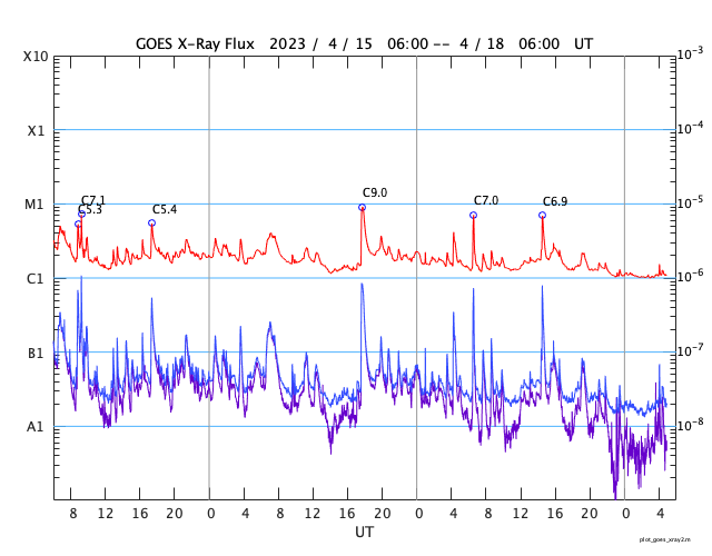 GOES衛星の太陽X線強度。赤・橙 = 0.1〜0.8 nm、青・紫 = 0.05〜0.4 nm (c) データ:NOAA/SWPC、作図:宇宙天気ニュース ![]() | ||||||||||||||||||||||||||||||||||||||||||||||||||||||||||||||||||||||||||||||||||||||||||||||||||||||||||||||||||||||||||||||||||||||||||||||||||||||||||||||||||||||||||||||||||||||||||||||||||||||||||||||||||||||||||||||||||||||||||||||||||||||||||||||||||||||||