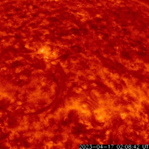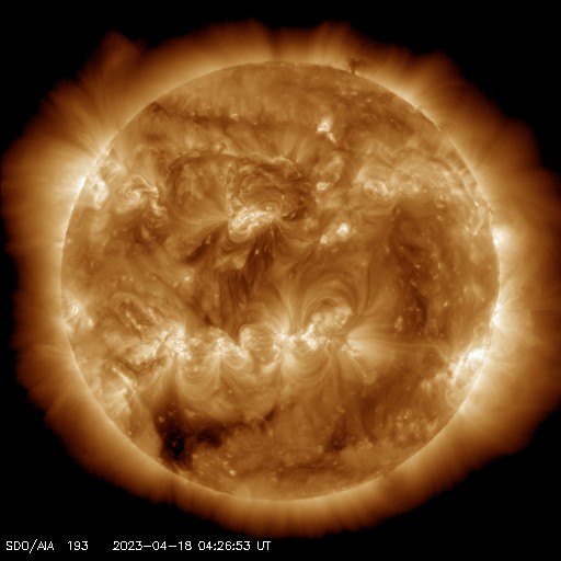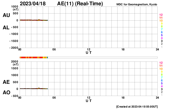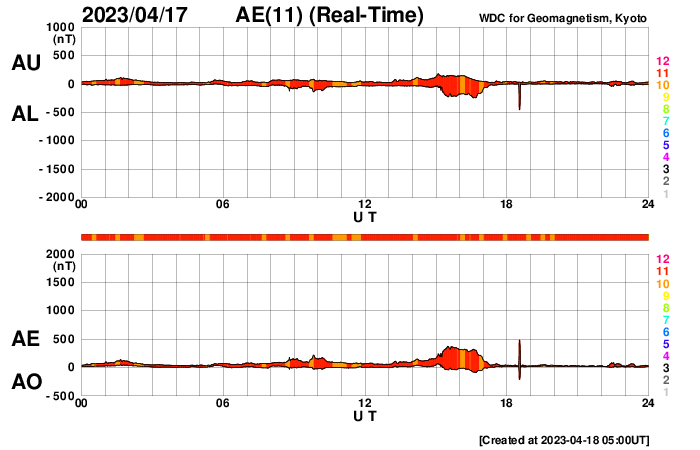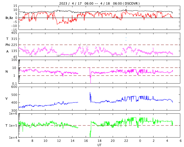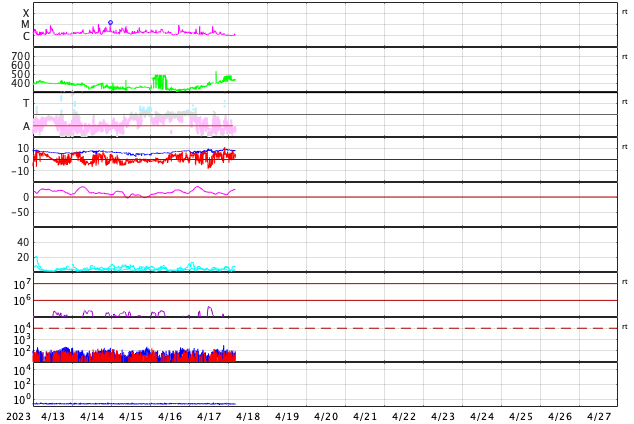 2023/ 4/18 14:01 更新 太陽風は平均的な速度に戻っています。磁気圏は穏やかです。 担当 篠原 太陽風の速度は、 350km/秒と低速の状態からゆっくりと上がり、 現在は430km/秒と平均的な速さに戻っています。 磁場強度は、8nTとやや強まった状態です。 SDO衛星AIA193で3日前頃に見えていた、 淡いコロナホールの影響が来ているのでしょうか。 磁場の南北成分は、北寄りで推移しています。 磁気圏は穏やかで、AE指数はほとんど変化のない状態です。 今日のSDO衛星AIA193の太陽コロナ写真では、 南東の端近く(左下)にコロナホールの薄暗い領域が見えています。 緯度が高めですが、 4〜5日後くらいに影響がやって来るかもしれません。 太陽は、南東の3283黒点群で、 C7.0、C6.9の小規模フレアが発生しています。 また、17日14時(世界時17日5時)頃に、 中心部の北側(上側)でフィラメント噴出が発生しています。 SDO衛星AIA304の動画を掲載します。 ダークフィラメントの薄暗い筋が 右上に向かって飛び出す様子が見えています。 また、17日21時(世界時17日12時)頃には、 中心部東側(左側)で爆発現象が発生した様で、 SDO衛星AIA193では、コロナが激しく動く様子が見えています。 SOHO衛星LASCO C2、C3では CME(コロナ質量放出)は特に見えていませんが、 中心付近で発生しているので、 3日後くらいに太陽風磁場の強まりなどが やって来るかもしれません。 その時に、磁場が南向きに強まると、 磁気圏の活動も活発になる可能性があります。