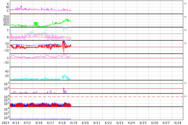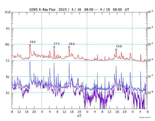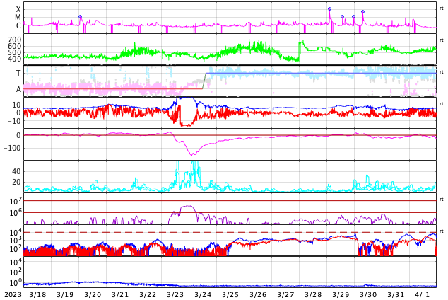 GOES衛星の太陽X線強度。赤・橙 = 0.1〜0.8 nm、青・紫 = 0.05〜0.4 nm (c) データ:NOAA/SWPC、作図:宇宙天気ニュース ![]() | |||||||||||||||||||||||||||||||||||||||||||||||||||||||||||||||||||||||||||||||||||||||||||||||||||||||||||||||||||||||||||||||||||||||||||||||||||||||||||||||||||||||||||||||||||||||||||||||||||||||||||||||||||||||||||||||||||||||||||||||||||||||||||||||||||||