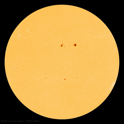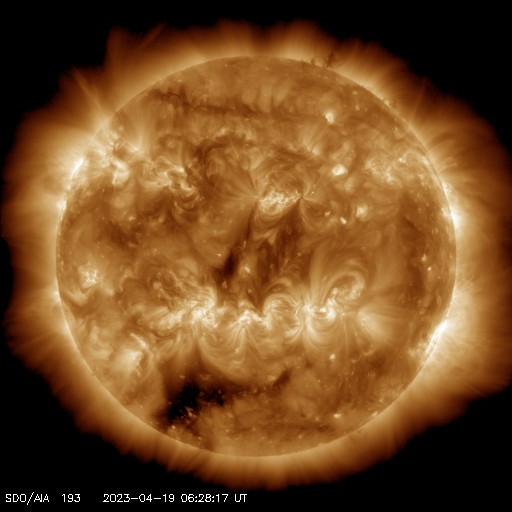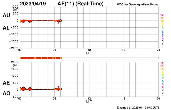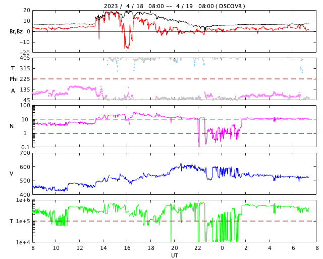 2023/ 4/19 16:31 更新 太陽風の急な強まりが到来しました。速度は高速になっています。 担当 篠原 昨夜、18日22時19分(世界時18日13時19分)に、 DSCOVR衛星で太陽風の急な強まりが観測されています。 速度は450km/秒から490km/秒、 磁場強度は、7nTから14nTという変化でしたが、 その後、どちらも更に上昇して、 昨夜遅くに磁場強度は18nTへ、 今朝早くに速度は600km/秒へ達しています。 その後はどちらも下がって、 磁場強度は6nTと平均的な強さに戻り、 速度は520km/秒と高速の状態が続いています。 初めに急な強まりが発生しているので、 16日の記事でお知らせしたCME(コロナ質量放出)の乱れが 到来したのかもしれません。 その後、速度がかなり高まっていますが、 こちらはコロナホールと関係しているのかもしれません。 磁場の南北成分は、一時的に南向きになった以外は、 全体的に北寄りになっています。 このため磁気圏の活動は比較的穏やかで、 AE指数は小規模の変化が発生した程度になっています。 太陽は、西の端に沈んだ3280黒点群と、 その南の3272黒点群で、 C1〜4の小規模フレアが度々発生しています。 この後、3272群も沈むと、 太陽は穏やかになるかもしれません。 ![]() SDO衛星のAIA193カメラによる太陽コロナの様子 (c) SDO (NASA) ![]() SDO衛星による太陽の可視光写真。マウスの矢印を写真に重ねると、黒点番号付きの写真に切り替わります。 (c) SDO (NASA) ![]() DSCOVRが観測した太陽風の磁場(黒線は全体の強度、赤線は南北成分) 磁場の向き、プラズマの密度、速度、温度 (c) データ:NOAA/SWPC、作図:宇宙天気ニュース ![]() AE指数(速報値) 下段のAEグラフの値が高くなると、オーロラ活動が活発化しています。 (c) 京都大学WDC ![]() ![]() 27日の太陽周期に合わせた図 太陽が同じ面を地球に向けていた27日前の変化から、今後を予想することができます。 (c) 作図:宇宙天気ニュース
