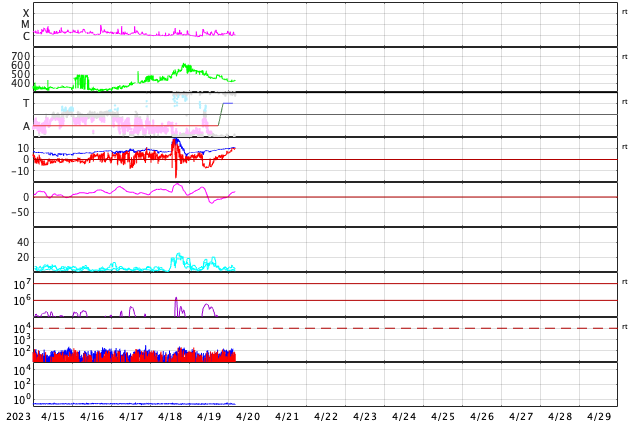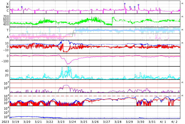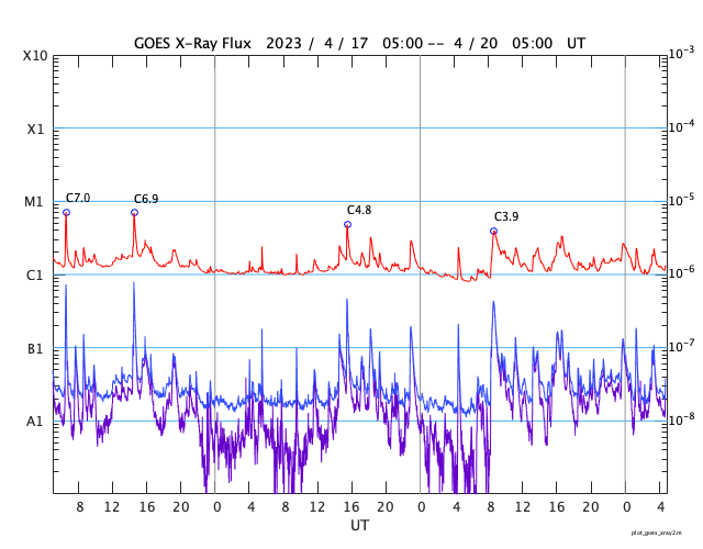 GOES衛星の太陽X線強度。赤・橙 = 0.1〜0.8 nm、青・紫 = 0.05〜0.4 nm (c) データ:NOAA/SWPC、作図:宇宙天気ニュース ![]() | |||||||||||||||||||||||||||||||||||||||||||||||||||||||||||||||||||||||||||||||||||||||||||||||||||||||||||||||||||||||||||||||||||||||||||||||||||||||||||||||||||||||||||||||||||||||||||||||||||||||||||||||||||||||||||||||||||||||||||||||||||||||||||