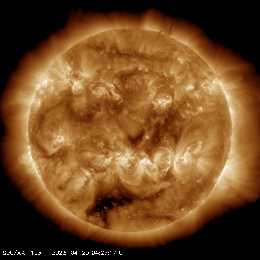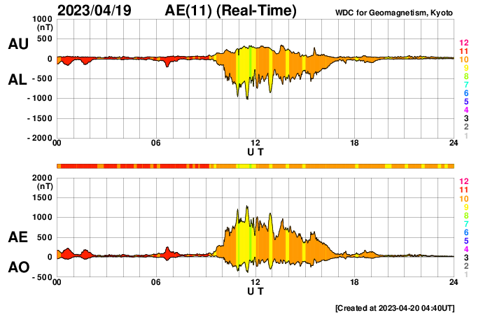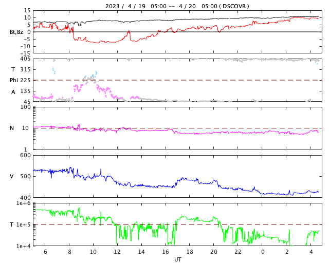 2023/ 4/20 13:51 更新 太陽風磁場が南向きに強まって、磁気圏の活動が活発になりました。 担当 篠原 太陽風の速度は、昨夜には500km/秒台を割り、 現在は420km/秒と平均的な速度に戻っています。 一方、磁場強度は、 7nTから12nTへゆっくり強まっています。 南北成分を見ると、昨夕、19日17時(世界時19日8時)頃に、 急に南向きに強まる変化が発生し、 -5〜 -8nT程度の南向きが6時間ほど続きました。 その後北向きに切り替わり、 現在は北向きに10nTまで強まっています。 磁場の変化の様子から、 CME(コロナ質量放出)の影響がやって来た様です。 16日のニュースでお知らせした 16日朝の噴出に関係するのかもしれません。 この場合、発生から到来まで3日半となり、 良さそうなタイミングです。 磁気圏は、磁場が南向きに強まった頃に活動的になり、 AE指数は、500〜1200nTの中・大規模の変化が 6時間ほど発生しています。 その後は、磁場が北向きになったので変化がなくなり、 現在の磁気圏は穏やかです。 この後、磁場の強まりは次第に低下に向かうと思います。 SDO衛星AIA193の太陽コロナ写真では、 南半球の緯度が高めの領域にコロナホールが見えています。 3日後くらいにこの領域の影響がやって来るかもしれません。 太陽は、中心部北西側(右上)の 3282黒点群の活動が少し強まって、 C2〜3の小規模フレアが数回発生しています。 全体としては比較的穏やかな状態です。 ![]() SDO衛星のAIA193カメラによる太陽コロナの様子 (c) SDO (NASA) ![]() SDO衛星による太陽の可視光写真。マウスの矢印を写真に重ねると、黒点番号付きの写真に切り替わります。 (c) SDO (NASA) ![]() DSCOVRが観測した太陽風の磁場(黒線は全体の強度、赤線は南北成分) 磁場の向き、プラズマの密度、速度、温度 (c) データ:NOAA/SWPC、作図:宇宙天気ニュース ![]() AE指数(速報値) 下段のAEグラフの値が高くなると、オーロラ活動が活発化しています。 (c) 京都大学WDC ![]() ![]() 27日の太陽周期に合わせた図 太陽が同じ面を地球に向けていた27日前の変化から、今後を予想することができます。 (c) 作図:宇宙天気ニュース