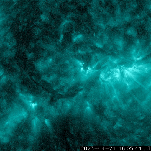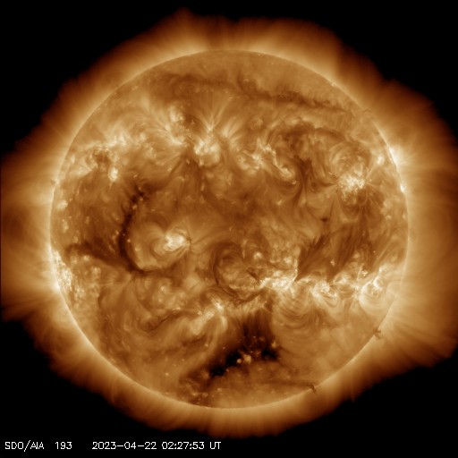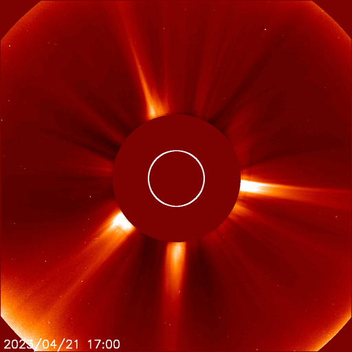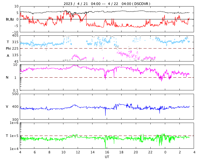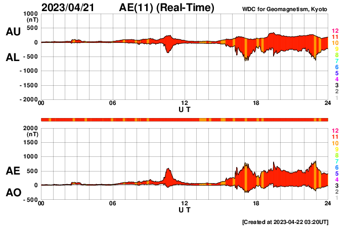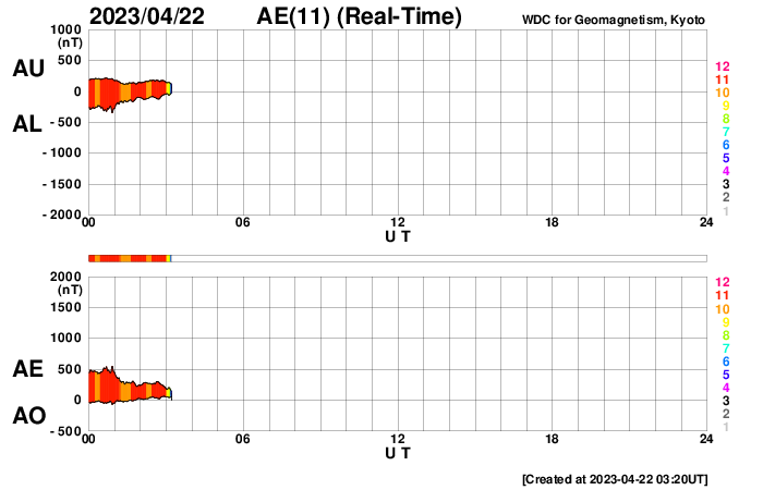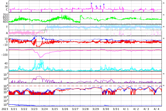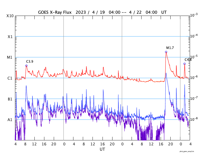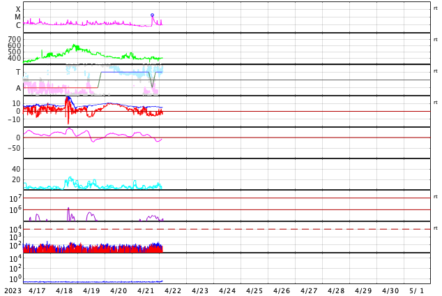 2023/ 4/22 12:31 更新 M1.7の中規模フレアが発生しました。ハロー型のCMEが発生しています。 担当 篠原 今日未明、22日2時半(世界時21日17時半)に、 太陽の中心部南西側(右下)の3283黒点群で M1.7の中規模フレアが発生しました。 SDO衛星AIA131の動画を掲載します。 Mフレアの発生は1週間ぶりで、 世界時14日のM1.5以来です。 X線グラフを見ると、 強度の高まりが長い時間続くタイプのフレアです。 SOHO衛星LASCO C2、C3では、 太陽を丸く囲むように広がるハロー型の きれいなCME(コロナ質量放出)が飛び出しています。 地球直撃間違いなしという見え方ですが、 太陽風の乱れの到来まで3日くらいと考えると、 24日の夜から25日の午前中くらいでしょうか。 フレアの規模がM1台なので、 太陽風の乱れも特に大きいということはなさそうですが、 SDO衛星AIA193の太陽コロナ写真を見ると、 中心部の南半球側にコロナホールが広がっています。 ここからの高速太陽風に重なる形で乱れがやって来ると、 より強まった形で擾乱が到来するかもしれません。 注目して下さい。 太陽風は、速度は400km/秒、磁場強度は5nTと 平均的な状態です。 磁場の南北成分は、 グラフの中盤から南寄りに傾向が変わっています。 このため、磁気圏の活動も高まっていて、 AE指数はグラフの途中から500〜700nTの 中規模の変化が続く様になっています。