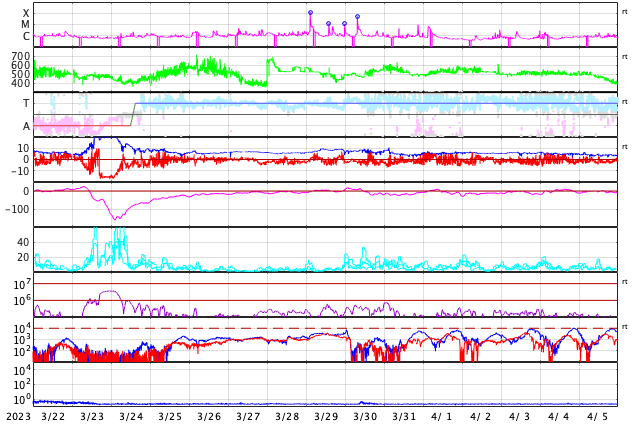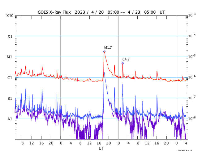 GOES衛星の太陽X線強度。赤・橙 = 0.1〜0.8 nm、青・紫 = 0.05〜0.4 nm (c) データ:NOAA/SWPC、作図:宇宙天気ニュース ![]() | ||||||||||||||||||||||||||||||||||||||||||||||||||||||||||||||||||||||||||||||||||||||||||||||||||||||||||||||||||||||||||||||||||||||||||||||||||||||||||||||||||||||||||||||||||||||||||||||||||||||||||||||||||||||||||||