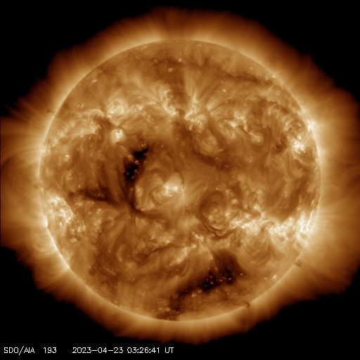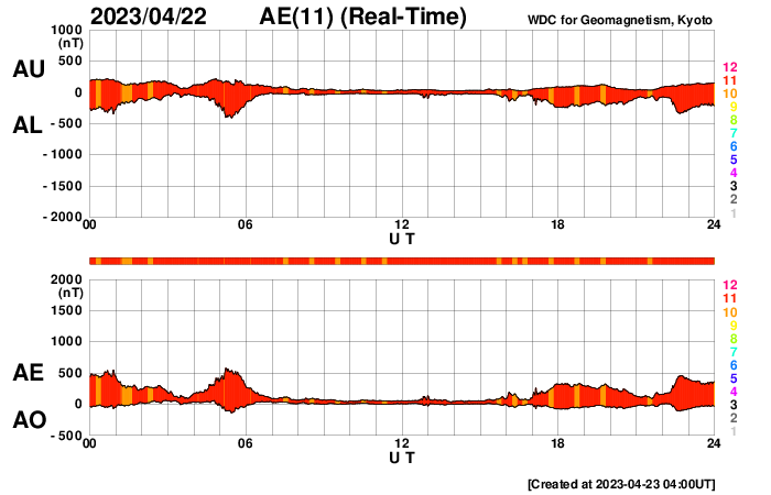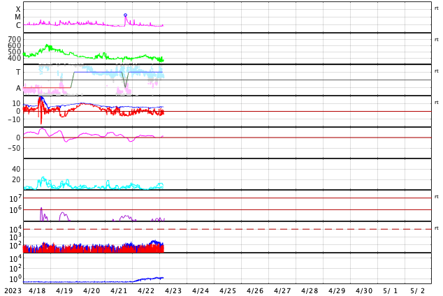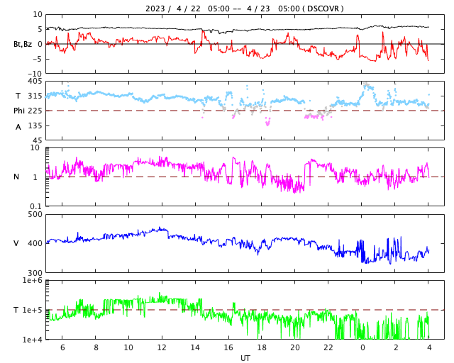 2023/ 4/23 13:18 更新 太陽風は低速になっています。CMEによる太陽風の乱れが明日到来する可能性があります。 担当 篠原 昨日の未明に発生したCME(コロナ質量放出)による 太陽風の乱れの到来は、 24日15時(世界時24日6時)頃になる可能性があると NOAA/SWPCが予報を発表しています。 この場合、乱れは2日半で 地球までやって来ることになります。 明日の午後以降は太陽風の変化に注目してください。 現在の太陽風は、速度が350〜370km/秒に下がり、 低速になっています。 磁場強度は、5〜6nTと平均的な状態です。 磁場の南北成分は、 グラフの後半から南寄りになっていて、 AE指数は小規模の変化が見られる様になっています。 SDO衛星AIA193では、 南半球のコロナホールは西側に進んでいます。 緯度が高めですが、 どのくらいの影響がやって来るでしょうか。 太陽は、C2の小さい小規模フレアが2回発生した程度で、 穏やかな状態になっています。 M1.7の中規模フレアを起こした3283黒点群も、 C2.0が1回だけと落ち着いた状態です。