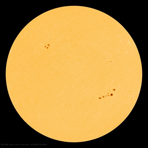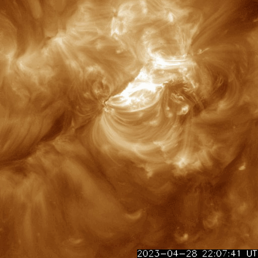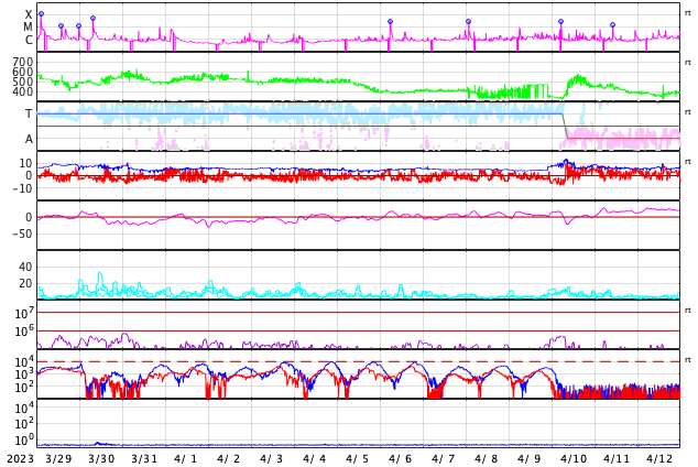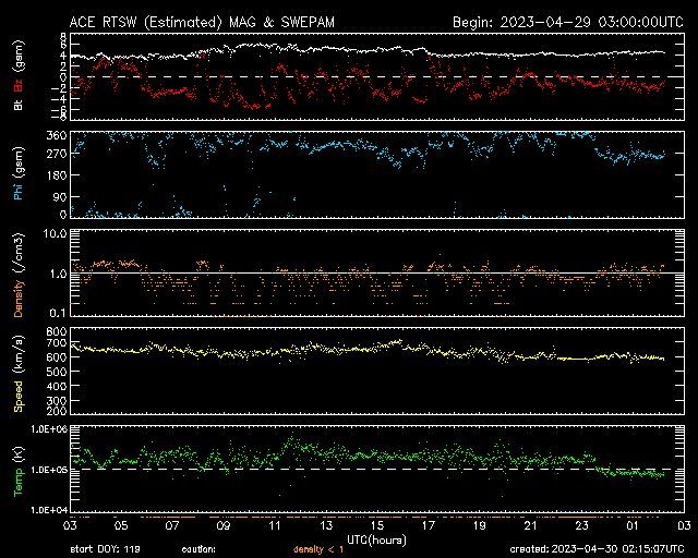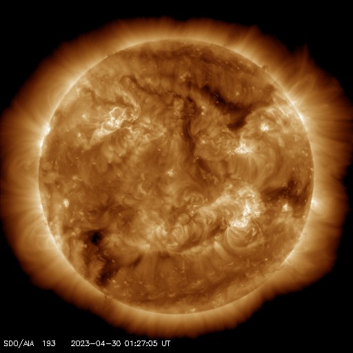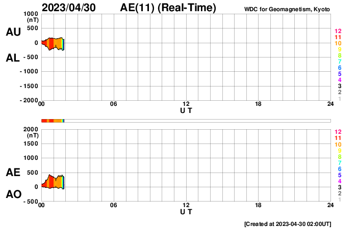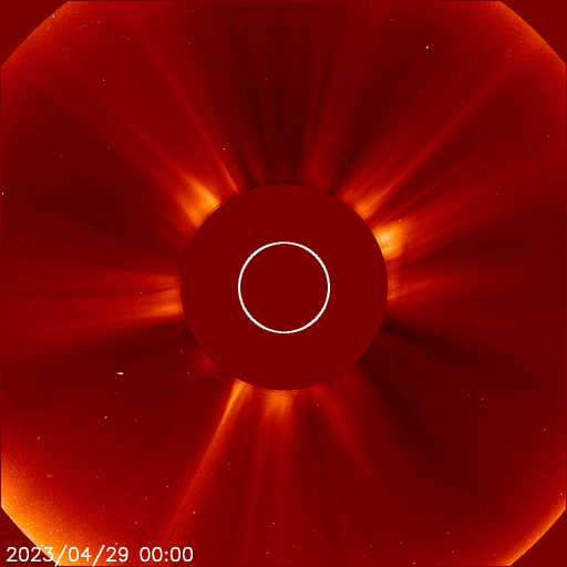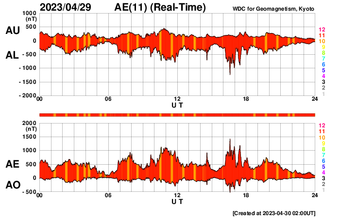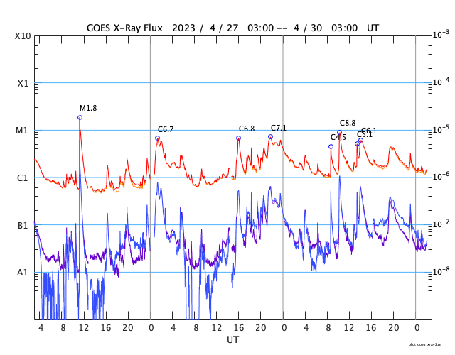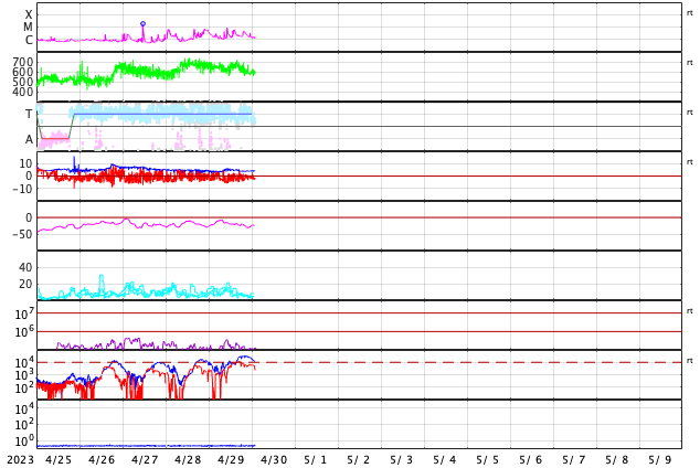 2023/ 4/30 11:16 更新 600km/秒台の高速太陽風が続いています。磁気圏も活動的です。 担当 篠原 太陽の南西側(右下)の3288黒点群で 昨日の朝、29日6時(世界時28日21時)に C7.1の小規模フレアが発生しましたが、 その後、右下側の領域と左側の領域で コロナの激しい動きが発生しています。 SDO衛星AIA193の動画を掲載します。 SOHO衛星LASCO C2、C3によると、 この爆発的な動きに続いて、 太陽の下寄りにCME(コロナ質量放出)が飛び出しています。 同時に左上にもCMEが飛び出していますが、 これは、別のフィラメント噴出によるものです。 CMEは下寄りに広がっていますが、 太陽の中心近くで発生しているので、 太陽風の乱れは地球方向にも向かっている可能性があります。 明日、明後日くらいに 磁場の強まりなどが到来するかもしれません。 太陽では3288群の活動が続いていて、 C8.8、C5.1、C6.0などの小規模フレアが発生しています。 黒点も目立っていて、引き続き注目してください。 太陽風は、ACE衛星の図を掲載しています。 速度は650km/秒から600km/秒に少し下がっていますが、 高速の状態が続いています。 磁場強度は4nTと平均的な状態です。 磁場の南北成分は、南寄りの変化が続いています。 磁気圏の活動は前日よりも高まっていて、 AE指数は1000nTを超える大きい変化が2回発生しています。 グラフの最後では磁場の南向きが弱まり、 AE指数の変化も小さくなっていますが、 この後はどの様に推移するでしょうか。 SDO衛星AIA193では、 太陽の中心部にコロナホールは見られません。 高速の太陽風はどこまで続くでしょうか。 ![]() 3288黒点群の周辺で発生した爆発現象。 (c) SDO衛星AIA193 (NASA)、(動画加工 : 宇宙天気ニュース) ![]() 太陽の下寄りに広がるCME。 (c) SOHO衛星LASCO C2、C3 (ESA & NASA)、(動画加工 : 宇宙天気ニュース) ![]() SDO衛星のAIA193カメラによる太陽コロナの様子 (c) SDO (NASA) ![]() SDO衛星による太陽の可視光写真。マウスの矢印を写真に重ねると、黒点番号付きの写真に切り替わります。 (c) SDO (NASA) ![]() GOES衛星の太陽X線強度。赤・橙 = 0.1〜0.8 nm、青・紫 = 0.05〜0.4 nm (c) データ:NOAA/SWPC、作図:宇宙天気ニュース ![]() ACEが観測した太陽風の磁場(1番上の枠、白線は全体の強度、赤線は南北成分) および、太陽風の密度(3番目の橙線)、速度(4番目の黄線) (c) NOAA/SWPC ![]() AE指数(速報値) 下段のAEグラフの値が高くなると、オーロラ活動が活発化しています。 (c) 京都大学WDC ![]() ![]() 27日の太陽周期に合わせた図 太陽が同じ面を地球に向けていた27日前の変化から、今後を予想することができます。 (c) 作図:宇宙天気ニュース
