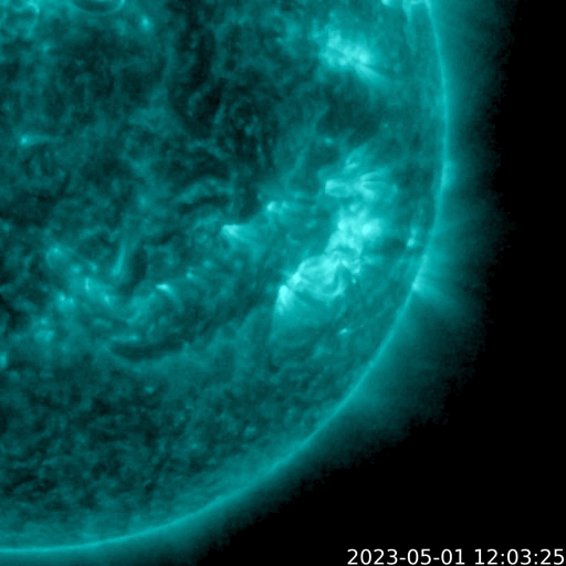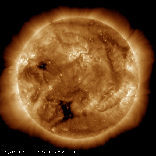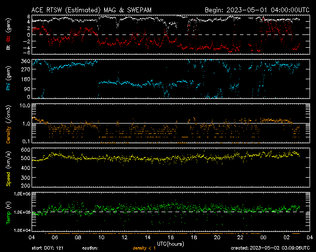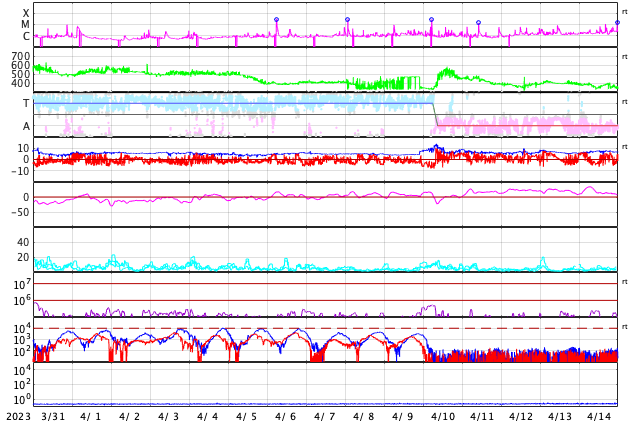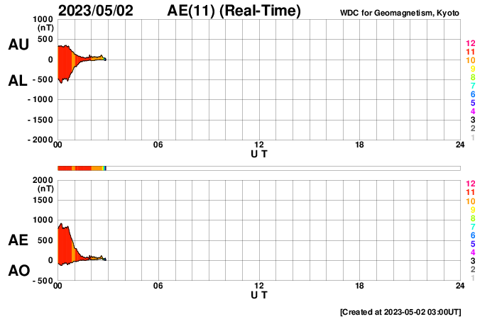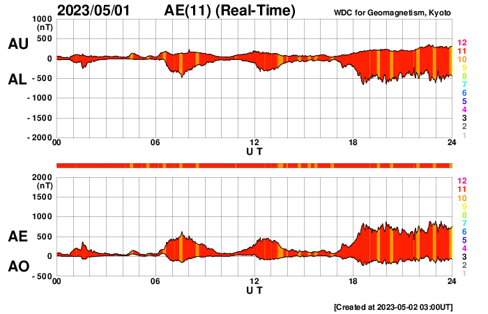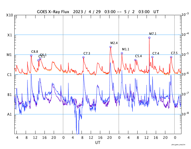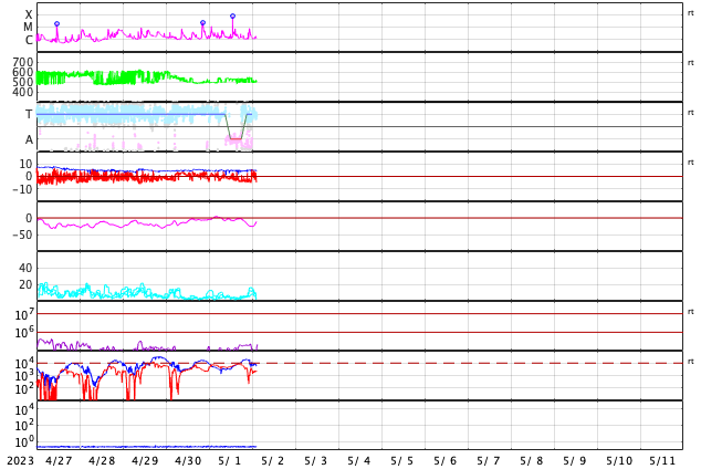 2023/ 5/ 2 12:10 更新 M7.1の中規模フレアが発生しました。太陽風は高速で、磁気圏も活動的です。 担当 篠原 昨夜、1日22時(世界時1日13時)に、 太陽の南西(右下)の3288黒点群で、 M7.1の中規模フレアが発生しました。 GOES衛星SUVI 131の動画を掲載します。 一瞬輝いてすぐに終わる、短い時間変化のフレアでした。 M7の規模に達するフレアの発生は、 3月29日のX1.2以来で、1か月ぶりです。 太陽では、北東(左上)の3293群と、 その左側の東端にかけての領域でもフレアが発生していて、 C5.3、C5.2、C7.4、C7.4などの小規模フレアが 次々に発生しています これらの領域にも注目して下さい。 太陽風は、速度が再び500km/秒に上がり、 高速の状態で推移しています。 磁場強度は5nTと平均的な状態です。 磁場の南北成分は、 グラフの後半で、-4nTと南向きにやや強まっています。 このため磁気圏の活動も強まって、 AE指数では800nTの中規模の変化がしばらく続いています。 4月24日に始まった今回の高速太陽風は、 9日目に入っています。 速度の高まりはどこまで続くのでしょうか。 また、SDO衛星AIA193では、 中心部の南側にコロナホールが見えています。 4日後くらいから、この領域の影響が始まりそうです。