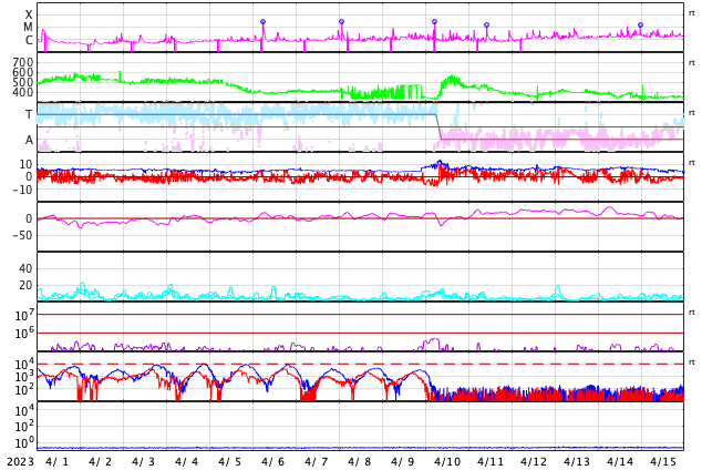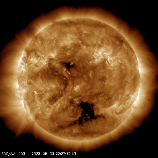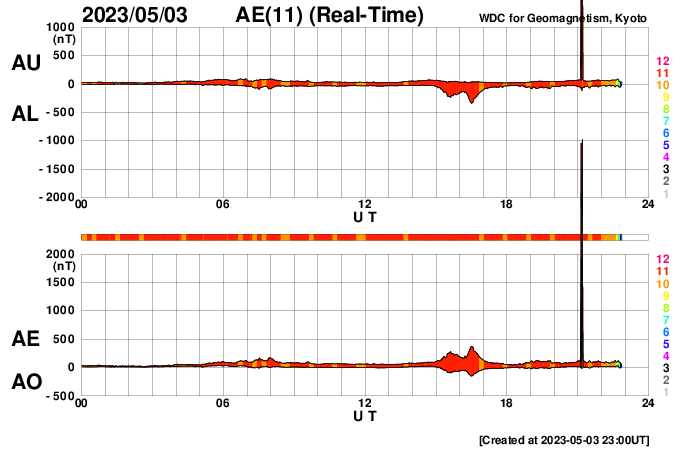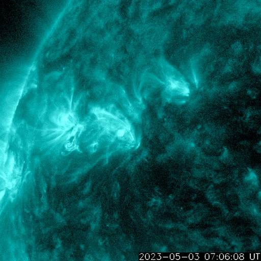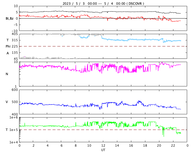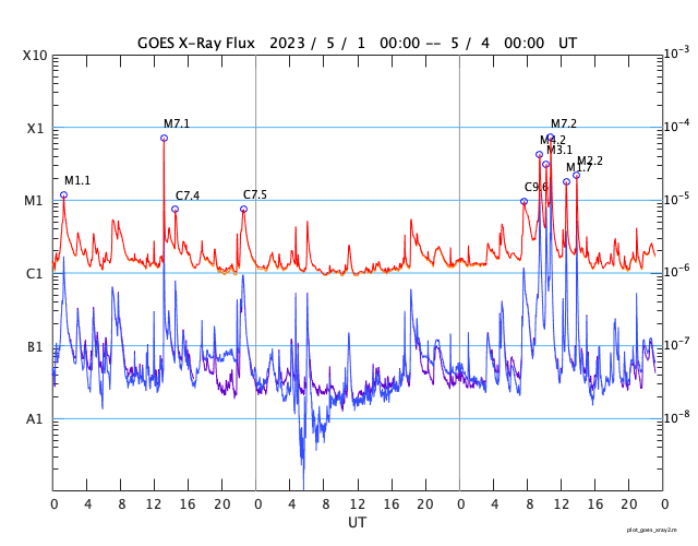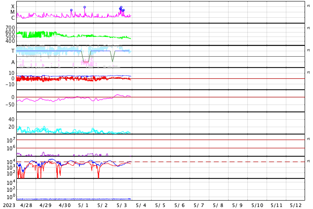 2023/ 5/ 4 08:15 更新 Mクラスの中規模フレアが5回連続で発生しました。太陽風は平均的な速度です。 担当 篠原 昨夕、3日18時半(世界時3日9時半)から、 太陽の北東側(左上)の3293黒点群の活動が強まり、 3日23時(世界時3日14時)にかけて M4.2、M3.1、M7.2、M1.7、M2.2と、 中規模フレアが5回連続で発生しました。 SDO衛星AIA131の動画を掲載します。 3293群は、穏やかな状態だったのですが、 急にこの時間帯に活動が強まりました。 この後はどうなるでしょうか。 しばらく注目して下さい。 太陽風は、 小幅ですが速度が480km/秒から450km/秒へ下がり、 平均的な速さに戻りつつあります。 磁場強度は5nTと平均的な状態です。 磁場の南北成分は、 弱い北向きから0nT付近で推移していました。 磁気圏は穏やかな状態が続き、 AE指数はほとんど変化がありません。 太陽風のグラフの最後で、磁場は弱い南向きになっています。 この傾向が続くと、 磁気圏で弱い変化が見られる様になりそうです。 SDO衛星AIA193では、 南側のコロナホールが、中心線を越えて西側に進んでいます。 明後日くらいから、この領域の影響で 太陽風の速度が再び高まる可能性があります。 ![]() 3293黒点群でMフレアが5回連続で発生しました。 (c) SDO衛星AIA131 (NASA)、(動画加工 : 宇宙天気ニュース) ![]() SDO衛星のAIA193カメラによる太陽コロナの様子 (c) SDO (NASA) ![]() SDO衛星による太陽の可視光写真。マウスの矢印を写真に重ねると、黒点番号付きの写真に切り替わります。 (c) SDO (NASA) ![]() GOES衛星の太陽X線強度。赤・橙 = 0.1〜0.8 nm、青・紫 = 0.05〜0.4 nm (c) データ:NOAA/SWPC、作図:宇宙天気ニュース ![]() DSCOVRが観測した太陽風の磁場(黒線は全体の強度、赤線は南北成分) 磁場の向き、プラズマの密度、速度、温度 (c) データ:NOAA/SWPC、作図:宇宙天気ニュース ![]() AE指数(速報値) 下段のAEグラフの値が高くなると、オーロラ活動が活発化しています。 (c) 京都大学WDC ![]() 27日の太陽周期に合わせた図 太陽が同じ面を地球に向けていた27日前の変化から、今後を予想することができます。 (c) 作図:宇宙天気ニュース