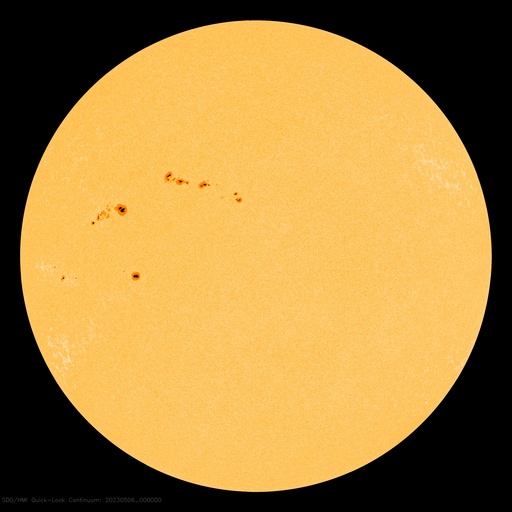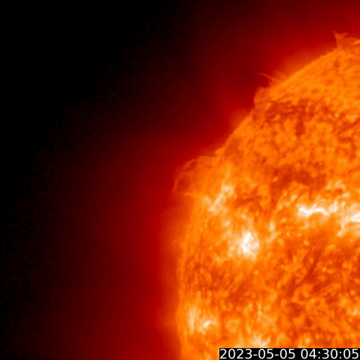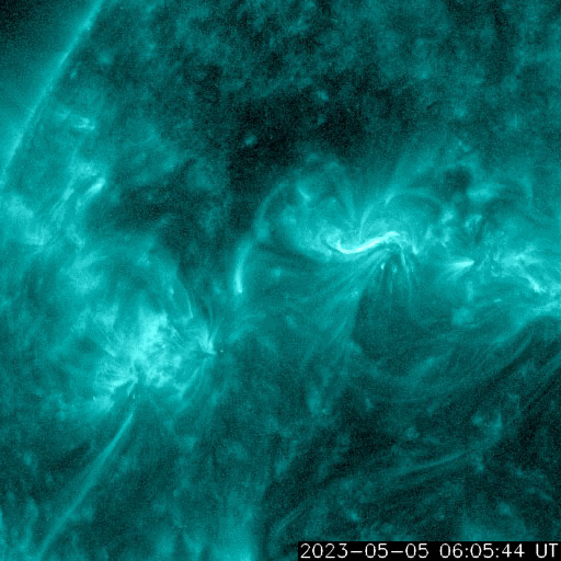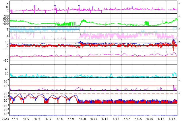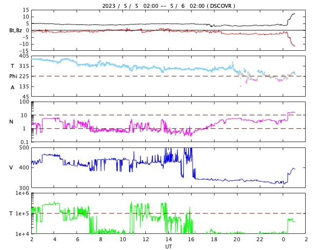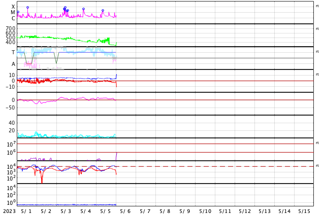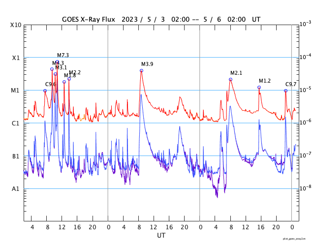 2023/ 5/ 6 10:20 更新 M2.1の中規模フレアが発生しました。太陽風の乱れが到来しています。 担当 篠原 昨夕、5日16時半(世界時5日7時半)に、 太陽の中心部北東側(左上)の3296黒点群で、 M2.1の中規模フレアが発生しました。 3296群では、4日のM3.9に続くMフレアです。 その直前に、左側の3297群でC9.5と Mクラスに近い小規模フレアが発生しています。 2つのフレアの様子を、 SDO衛星AIA131の動画で紹介します。 さらに、その直前の5日15時(世界時5日6時)頃には、 東端(左端)でプロミネンス噴出が発生しています。 GOES衛星SUVI 304の動画を掲載します。 太陽の左に向かって、コロナが大きく噴き出しています。 これらの活動により、CME(コロナ質量放出)が発生しています。 SOHO衛星LASCO C2、C3の動画を見ると、 初めにプロミネンス噴出によるCMEが太陽の左側に、 続いて、M2.1フレアによるCMEが 太陽を丸く囲むように広がっています。 この噴出による太陽風の乱れは、 NOAA/SWPCの予報では、 明後日の夜、8日21時(世界時8日12時)頃に 到来する可能性があるとのことで、 地球まで3日くらいかかると考えている様です。 注目して下さい。 3296群では、 その後、M1.2の中規模フレアが発生しています。 また、X線グラフの最後のC9.7の小規模フレアは、 南西の端(右下)で発生しています。 太陽風は、DSCOVR衛星の速度データがやや不安定なので、 ACE衛星のグラフも掲載します。 これらを見ると、速度は400km/秒から320km/秒へさがり、 低速になっています。 磁場強度は、3〜4nTとやや弱い状態でした。 そして、DSCOVR衛星のグラフの最後、 6日9時半(世界時6日0時半)に、 速度が320km/秒から400km/秒へ、 磁場強度が3nTから12nTヘ、 急に強まる変化が発生しています。 対応する現象がどれか分からないのですが、 CMEによる太陽風の乱れが到来した様です。 磁場の南北成分は、-12nTと南向きに大きく強まっています。 この状態が続くと、磁気圏の活動が強まります。 速度は平均的な状態なので、 激しい乱れにはならないと思います。 この後の太陽風の変化に注目して下さい。
