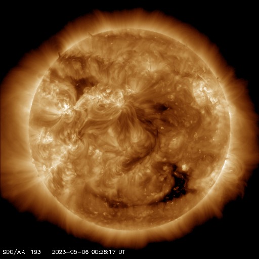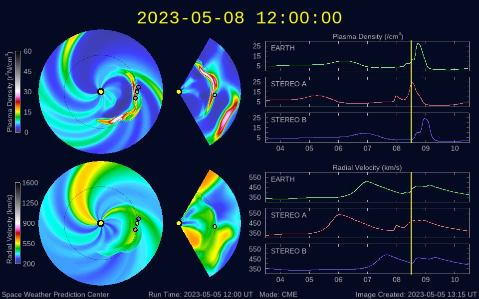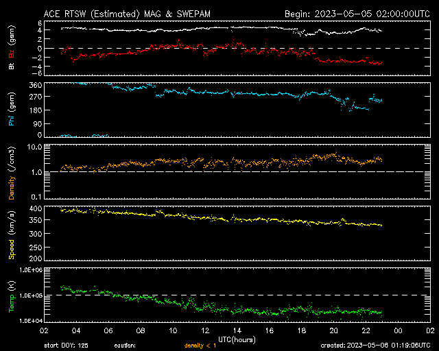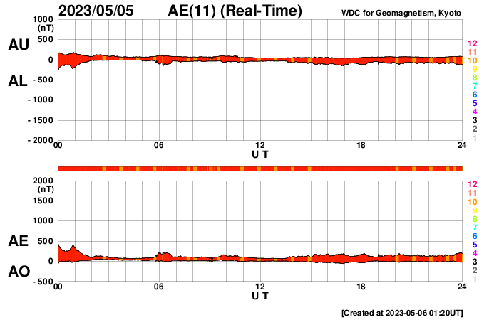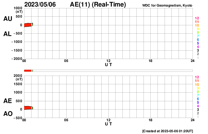 (c) SDO衛星AIA131 (NASA)、(動画加工 : 宇宙天気ニュース) ![]() 太陽の東端で発生したプロミネンス噴出。 (c) GOES衛星SUVI 304 (NOAA)、(動画加工 : 宇宙天気ニュース) ![]() 太陽の左に飛び出すCMEと、丸く囲むハロー型のCME。 (c) SOHO衛星LASCO C2、C3 (ESA & NASA)、(動画加工 : 宇宙天気ニュース) ![]() 太陽風の乱れは、8日21時(世界時8日12時)頃に到来する可能性があります。 (c) NOAA/SWPC ![]() SDO衛星のAIA193カメラによる太陽コロナの様子 (c) SDO (NASA) ![]() SDO衛星による太陽の可視光写真。マウスの矢印を写真に重ねると、黒点番号付きの写真に切り替わります。 (c) SDO (NASA) ![]() GOES衛星の太陽X線強度。赤・橙 = 0.1〜0.8 nm、青・紫 = 0.05〜0.4 nm (c) データ:NOAA/SWPC、作図:宇宙天気ニュース ![]() DSCOVRが観測した太陽風の磁場(黒線は全体の強度、赤線は南北成分) 磁場の向き、プラズマの密度、速度、温度 (c) データ:NOAA/SWPC、作図:宇宙天気ニュース ![]() ACEが観測した太陽風の磁場(1番上の枠、白線は全体の強度、赤線は南北成分) および、太陽風の密度(3番目の橙線)、速度(4番目の黄線) (c) NOAA/SWPC ![]() AE指数(速報値) 下段のAEグラフの値が高くなると、オーロラ活動が活発化しています。 (c) 京都大学WDC ![]() ![]() 27日の太陽周期に合わせた図 太陽が同じ面を地球に向けていた27日前の変化から、今後を予想することができます。 (c) 作図:宇宙天気ニュース