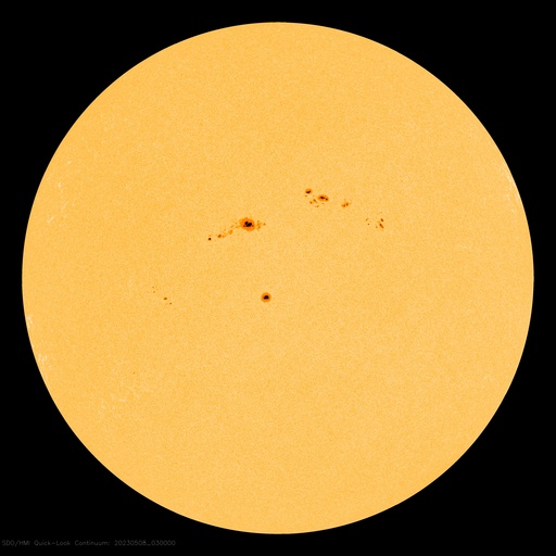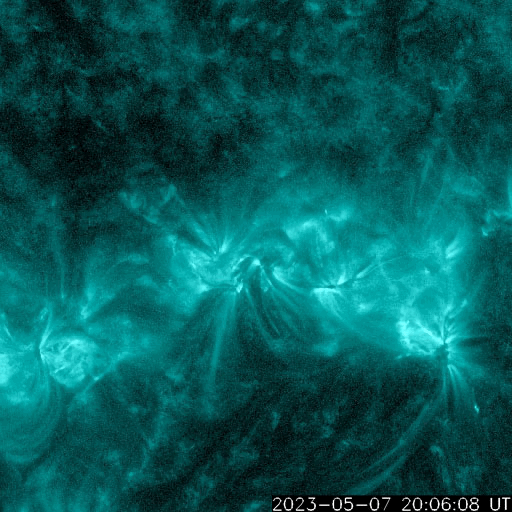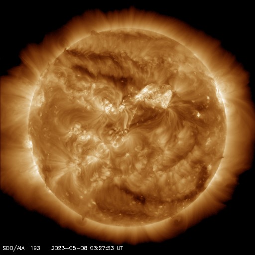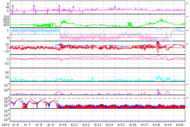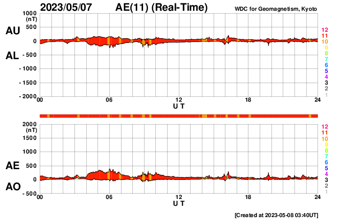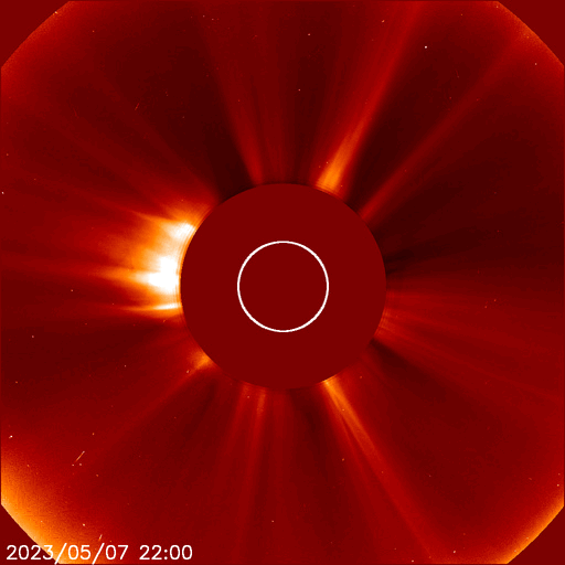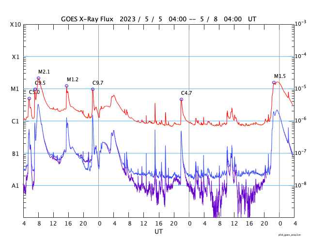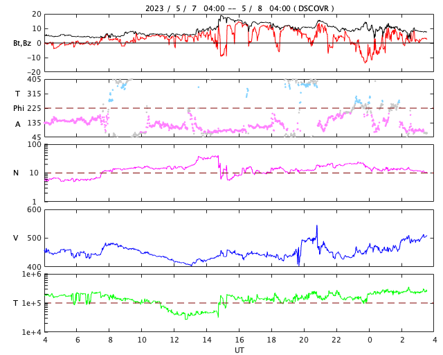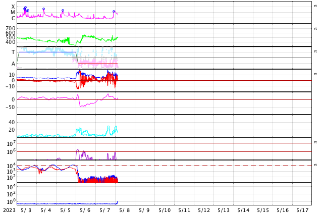 2023/ 5/ 8 12:48 更新 M1.5、M1.6の中規模フレアが発生し、ハロー型のCMEが広がっています。 担当 篠原 太陽の中心部北側(上側)の3296黒点群で、 今朝、8日6時班(世界時7日21時半)にM1.5、 直後の8日8時(世界時7日23時)にM1.6の 中規模フレアが発生しました。 X線強度のグラフを見ると、 自動認識のM1.5の〇印の後に、 もうひとつ強度の山が発生しています。 こちらがM1.6のピークです。 SDO衛星AIA131の動画を掲載します。 この動画で2つの輝きを見つけるのは難しいです。 SOHO衛星LASCO C2、C3では、 太陽を丸く囲むように広がる ハロー型のCME(コロナ質量放出)が観測されています。 太陽の中心部で発生しているので、 地球へやって来るのは間違いないでしょう。 到来は明後日、10日頃でしょうか。 この後のNOAA/SWPCの太陽風予報に注目してください。 太陽風は、深夜、8日0時(世界時7日15時)頃に、 磁場強度が19nTに強まる変化が発生しています。 速度は450km/秒付近で、特に変化していません。 昨日お知らせしたNOAA/SWPCの予報通りに、 CMEの乱れが到来したのかもしれません。 その後、磁場強度はゆっくりと下がって、 現在は8nTと少し強まった状態です。 速度は500km/秒に上がって、高速になっています。 磁場の南北成分は、主に北向きに強まっています。 このため磁気圏の活動は特に高まらず、 AE指数は、グラフの最後に 600nTの中規模の変化が発生した程度です。