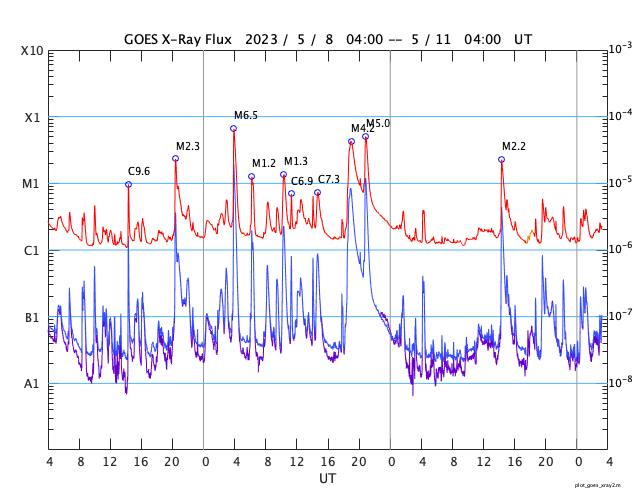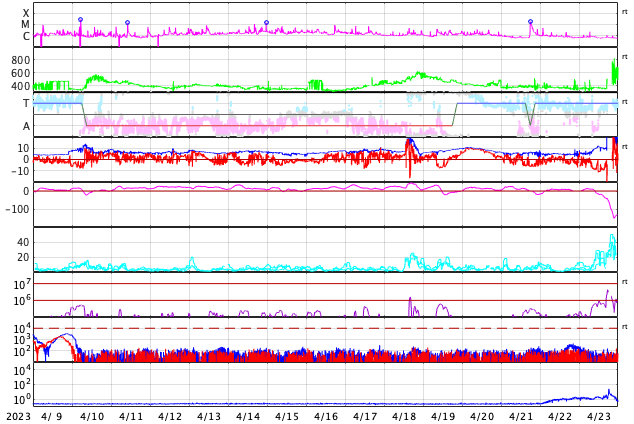GOES衛星の太陽X線強度。赤・橙 = 0.1〜0.8 nm、青・紫 = 0.05〜0.4 nm (c) データ:NOAA/SWPC、作図:宇宙天気ニュース ![]() | ||||||||||||||||||||||||||||||||||||||||||||||||||||||||||||||||||||||||||||||||||||||||||||||||||||||||||||||||||||||||||||||||||||||||||||||||||||||||||||||||||||||||||||||||||||||||||||||||||||||||||||||||||||||||||||||||||||||||||||||||||||||||||||||||||||||||||||||||||||||||||||||||||||||||||||||||||||||||||
