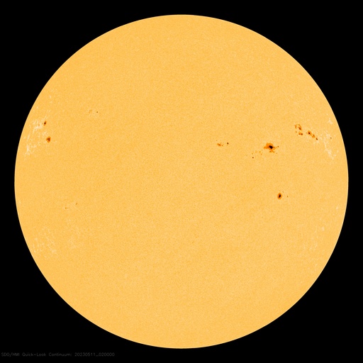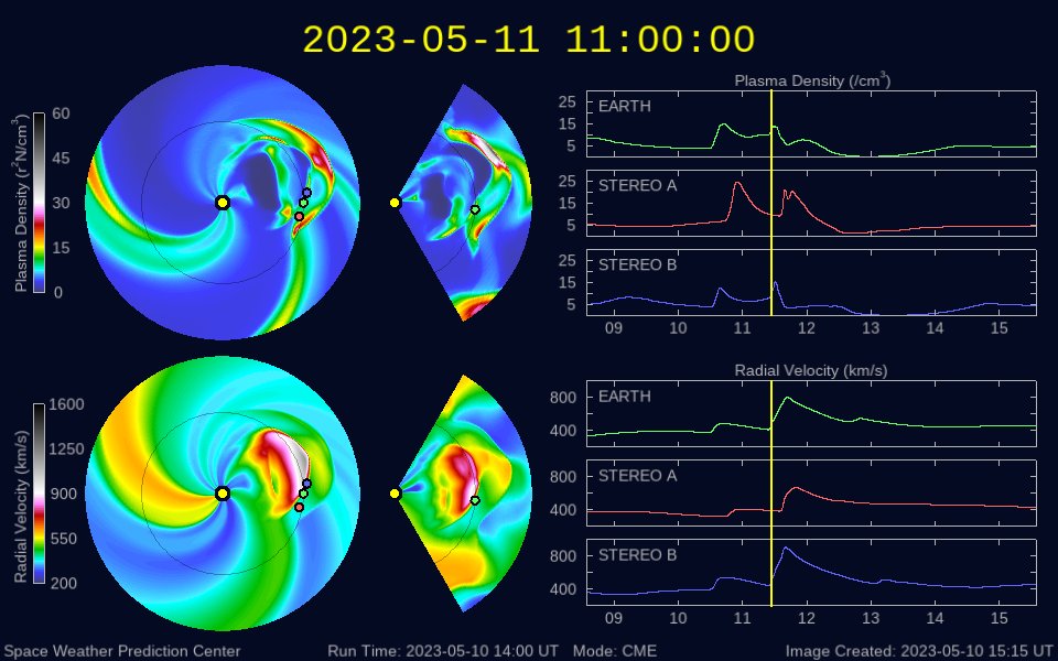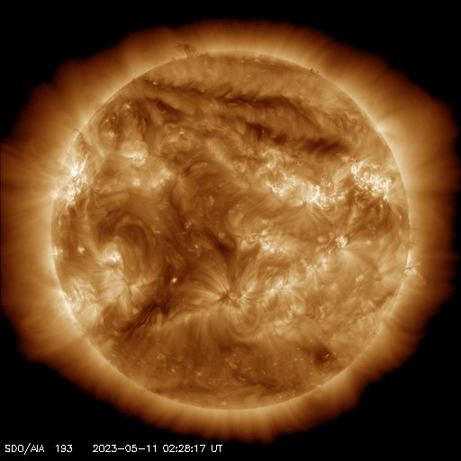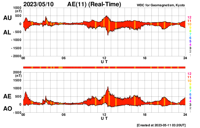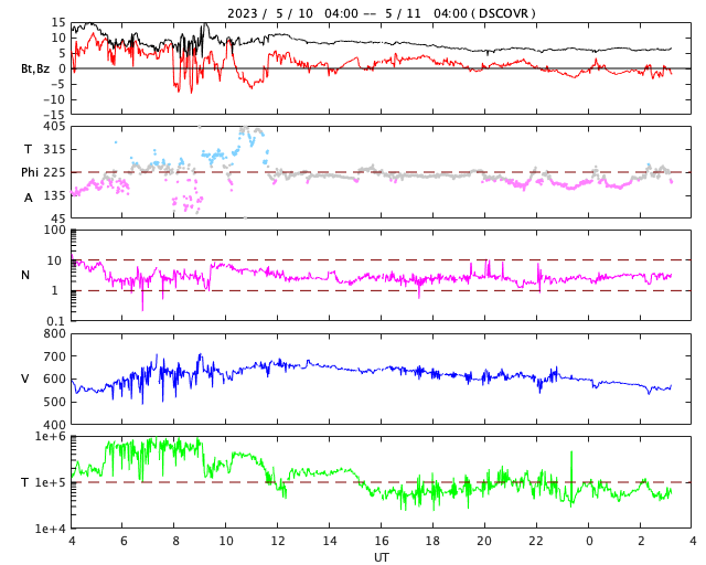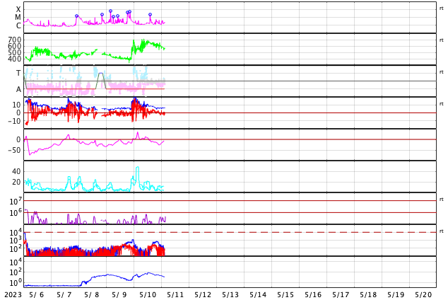 2023/ 5/11 12:30 更新 高速の太陽風が続いています。昨日のCMEによる乱れが近付いています。 担当 篠原 昨日未明に発生したCME(コロナ質量放出)による太陽風の乱れは、 NOAA/SWPCの予報では、 今夜、11日20時(世界時11日11時)頃に 地球にやって来る可能背があるとのことです。 この場合、2日弱での到来となります。 今夜以降、太陽風の変化に注目して下さい。 昨日、550〜600km/秒に高まっていた太陽風の速度は、 夜にかけて650km/秒に高まりました。 今日に入ると低下が始まって、 現在は550km/秒と高速の状態は続いていますが、 昨日程度に戻っています。 太陽風の磁場強度は、6nTと平均的な状態に戻っています。 南北成分は、0nTを挟んで弱く南北に変化しています。 AE指数は、500nTの中規模の変化が発生して、 やや活動的な状態です。 次のCMEでは、どの様な変化が到来するでしょうか。 磁場が南向きに強まると、 オーロラなどの磁気圏活動が激しくなる可能性があります。 太陽は、北西(右上)に進んだ3293黒点群で、 昨夜、10日23時(世界時10日14時)に、 M2.2の中規模フレアが発生しています。 その後も、3293群と隣の3296群で、 C5.7、C4.3、C4.5などの小規模フレアが発生しています。 X線グラフを見ると、活動の勢いは下がってきた様ですが、 引き続き注目してください。