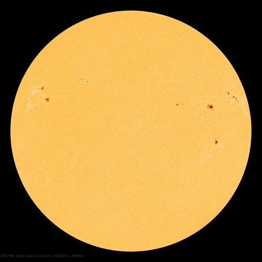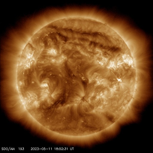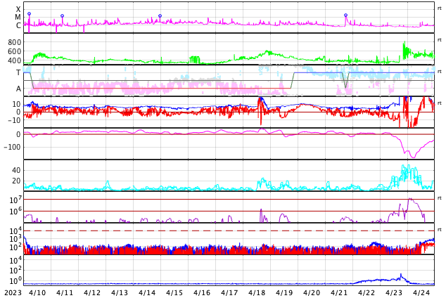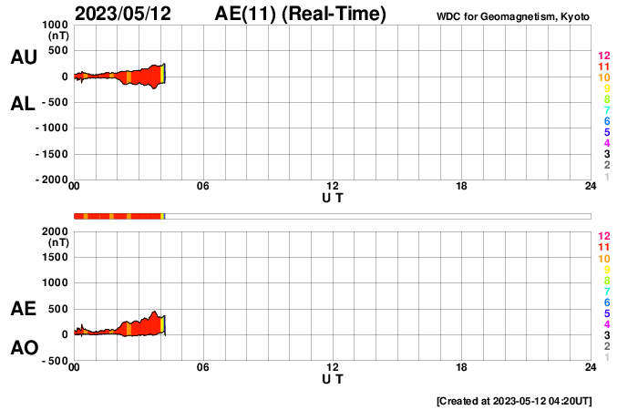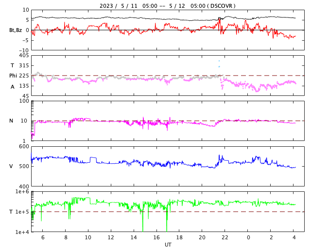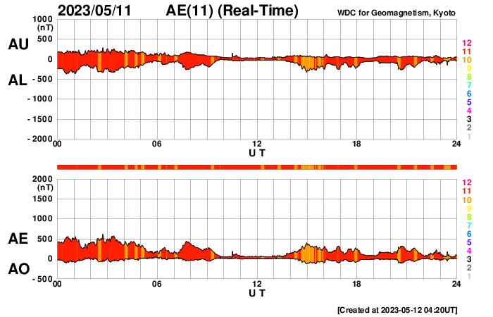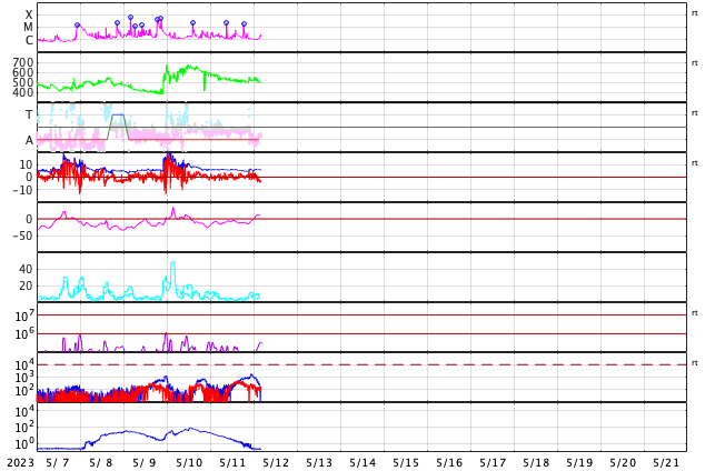 2023/ 5/12 13:25 更新 高速の太陽風が続いています。CMEによる乱れはまだです。 担当 篠原 太陽風の速度は、 500〜520km/秒と高速の状態で安定しています。 磁場強度は、5〜6nTと平均的な状態が続いています。 一昨日、10日未明のCME(コロナ質量放出)による太陽風の乱れは、 まだ到来していない様です。 発生から2日半経ったくらいなので、 そろそろやって来るのではないでしょうか。 引き続き注目してください。 AE指数は、300nTくらいの小規模の変化が続いていて、 磁気圏はやや活動的な状態です。 太陽は、南西(右下)の3294黒点群で、 昨夕、11日18時(世界時11日9時)にM2.1、 今日未明、12日3時(世界時11日18時)にM1.8と、 中規模フレアが2回発生しています。 西の端(右端)に近付いた3296群でも、 C6.2、C3.4などの小規模フレアが発生しています。