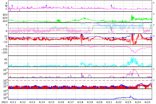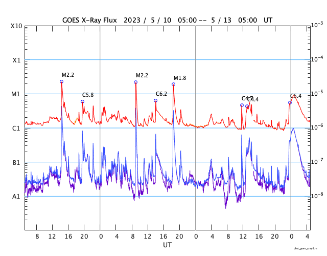GOES衛星の太陽X線強度。赤・橙 = 0.1〜0.8 nm、青・紫 = 0.05〜0.4 nm (c) データ:NOAA/SWPC、作図:宇宙天気ニュース ![]() | ||||||||||||||||||||||||||||||||||||||||||||||||||||||||||||||||||||||||||||||||||||||||||||||||||||||||||||||||||||||||||||||||||||||||||||||||||||||||||||||||||||||||||||||||||||||||||||||||||||||||||||||||||||||||||||||||||||||||||||||||||||||||||||||||||||||||||||||||||||||||||||||||