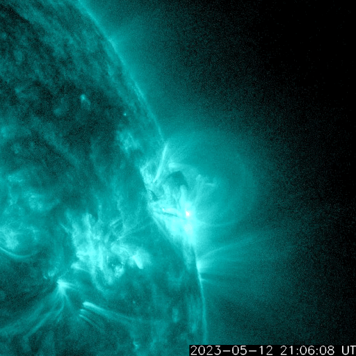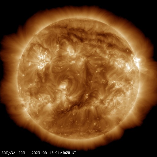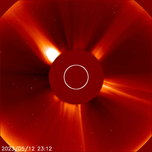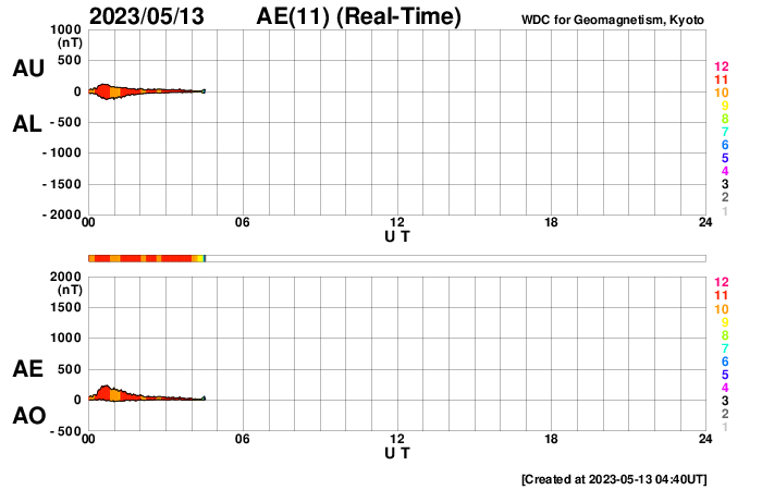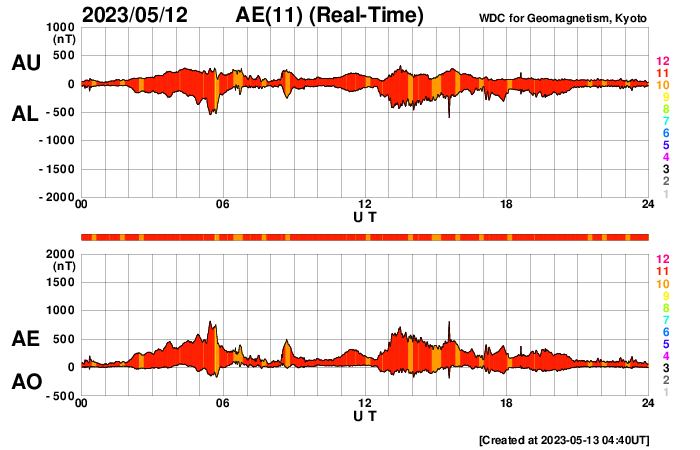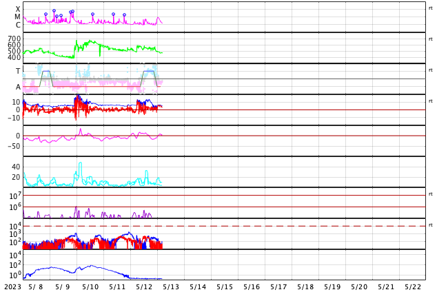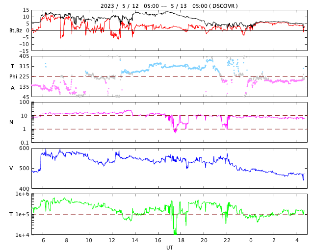 2023/ 5/13 13:59 更新 CMEによる太陽風の乱れが到来しましたが、磁気圏の活動は強まりませんでした。 担当 篠原 太陽風の乱れは、昨日の午後、12日15時(世界時12日6時)頃に DSCOVR衛星で観測されました。 掲載のグラフの左端近くに変化が見えています。 太陽風の速度は、480km/秒から580km/秒へ、 磁場強度は、6nTから12nT程度へそれぞれ強まっています。 磁場の南北成分は、10nTくらいに大きく変化していますが、 ほとんど北向きでした。 このため磁気圏の活動は特に強まらず、 AE指数は500nTに達する中規模の変化が起きた程度です。 今日未明くらいから太陽風の速度は次第に下がり、 現在は470km/秒とやや高速程度です。 磁場強度も5nTと平均的な状態に戻っています。 磁場の南北成分は、北寄りの傾向が続いていて、 磁気圏も穏やかです。 太陽では、今朝、13日9時(世界時13日0時)に、 北西の端(右上)に達した3296黒点群で、 C9.1の小規模フレアが発生しました。 SDO衛星AIA131の動画を掲載します。 コロナが飛び出して行く様子も見えています。 SOHO衛星LASCo C2、C3では、 太陽の右に向かうCME(コロナ質量放出)が観測されています。 地球に対しては横向きなので、影響はありません。