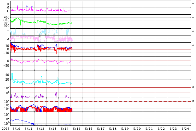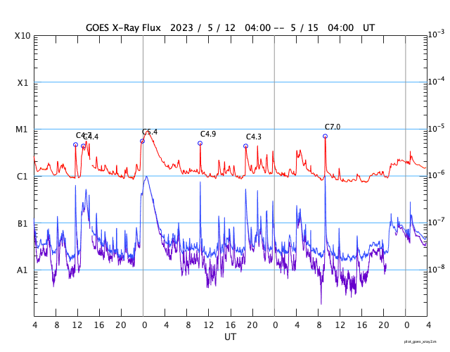 GOES衛星の太陽X線強度。赤・橙 = 0.1〜0.8 nm、青・紫 = 0.05〜0.4 nm (c) データ:NOAA/SWPC、作図:宇宙天気ニュース ![]() | ||||||||||||||||||||||||||||||||||||||||||||||||||||||||||||||||||||||||||||||||||||||||||||||||||||||||||||||||||||||||||||||||||||||||||||||||||||||||||||||||||||||||||||||||||||||||||||||||||||||||||||||||||||||||||||||||||||||||||||||||||||||||||||||||||||
