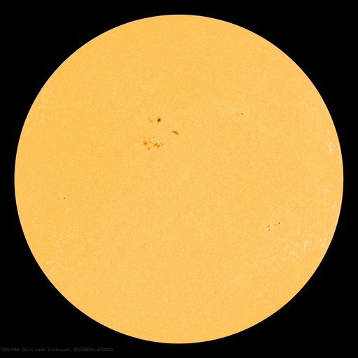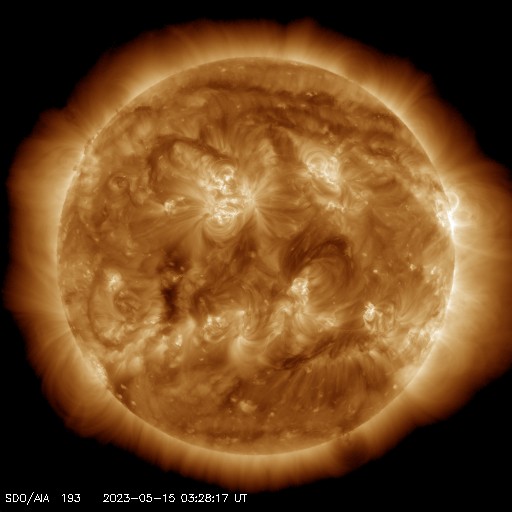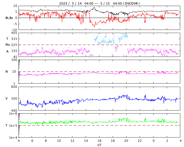 2023/ 5/15 12:51 更新 太陽風は高速になっています。磁気圏は穏やかです。 担当 篠原 太陽風の速度は、450km/秒から500km/秒付近へ上がり、 高速になっています。 磁場強度は、6nTと平均的な状態で推移しています。 磁場の南北成分は、 グラフの途中で一時的に南向きになっていますが、 その他は北寄りで推移しています。 AE指数も、1000nTに達する大きい変化が発生していますが、 その前後は静かな状態が続いています。 SDO衛星AIA193では、コロナホールは特に見られません。 太陽風はこの後どの様に推移するでしょうか。 太陽では、西の端に沈んだ3296黒点群で、 昨夕、14日18時(世界時14日9時)に C7.0の小規模フレアが発生しました。 フレアの上の部分しか見えていないので、 実際の規模はこれよりも大きかったのではないでしょうか。 その他の領域は、小さい変化が見られる程度です。 ![]() SDO衛星のAIA193カメラによる太陽コロナの様子 (c) SDO (NASA) ![]() SDO衛星による太陽の可視光写真。マウスの矢印を写真に重ねると、黒点番号付きの写真に切り替わります。 (c) SDO (NASA) ![]() DSCOVRが観測した太陽風の磁場(黒線は全体の強度、赤線は南北成分) 磁場の向き、プラズマの密度、速度、温度 (c) データ:NOAA/SWPC、作図:宇宙天気ニュース ![]() AE指数(速報値) 下段のAEグラフの値が高くなると、オーロラ活動が活発化しています。 (c) 京都大学WDC ![]() ![]() 27日の太陽周期に合わせた図 太陽が同じ面を地球に向けていた27日前の変化から、今後を予想することができます。 (c) 作図:宇宙天気ニュース