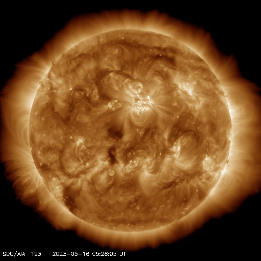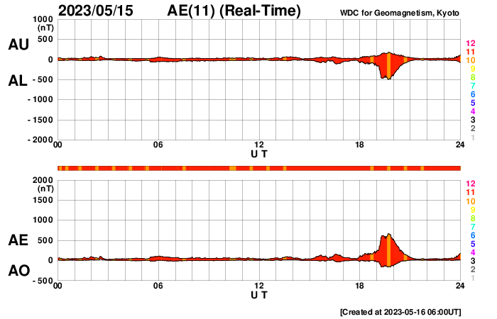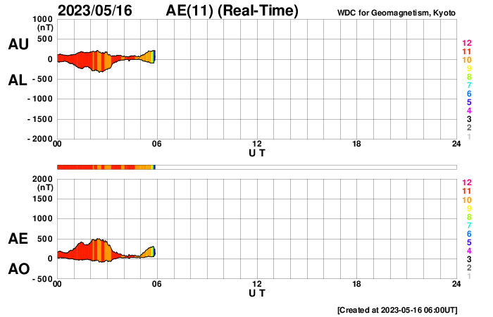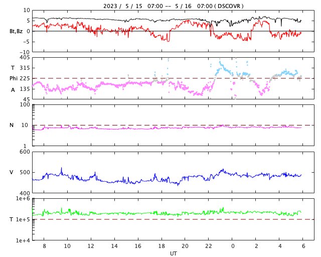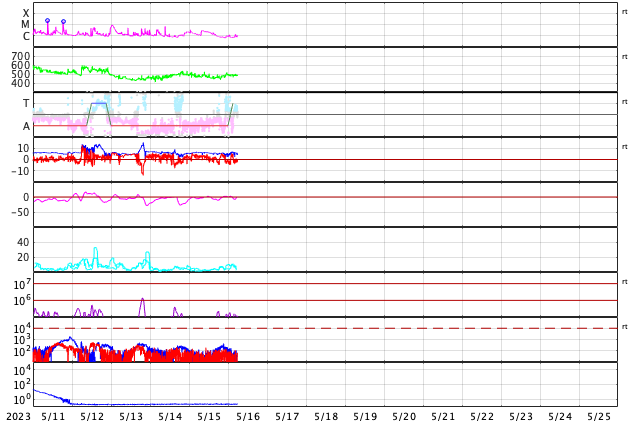 2023/ 5/16 15:09 更新 太陽風はやや高速です。磁気圏もやや活動的になっています。 担当 篠原 太陽風は、450〜480km/秒とやや高速の状態で推移しています。 磁場強度は、6nTと平均的な状態です。 磁場の南北成分は、グラフの前半は北寄りですが、 後半からやや南寄りで変化する様になっています。 このため、AE指数は後半で500nTの中規模の変化が発生していて、 磁気圏も少し活動的になっている様です。 SDO衛星AIA193では、コロナホールは特に見えていませんが、 太陽風の速度は高めの状態が続いています。 太陽のX線グラフでは、 昨夕、15日16時半(世界時15日7時半)に 継続時間の長いC2.9の高まりが発生しています。 これは、太陽の南東の端(左下)の向こう側で 発生したフレアによるものです。 実際にはどの様な規模だったのでしょうか。 この後もこの領域の活動が続く様であれば、 こちら側に現れるので注目です。