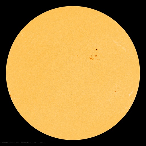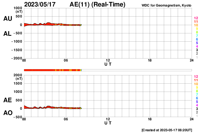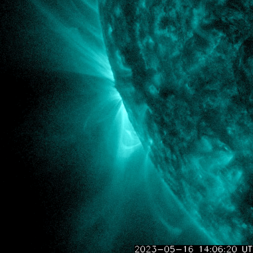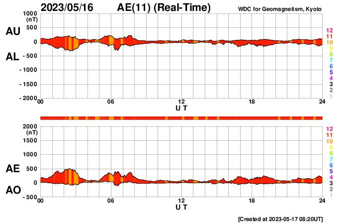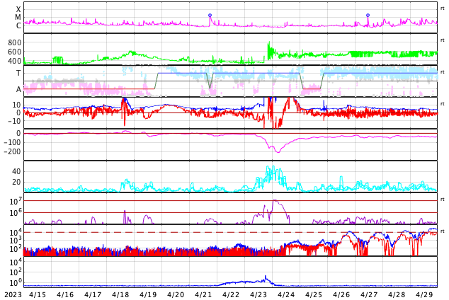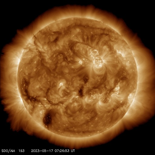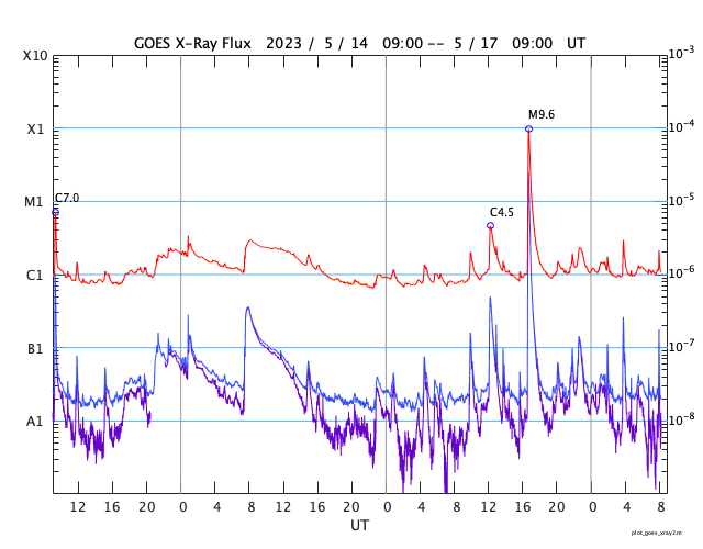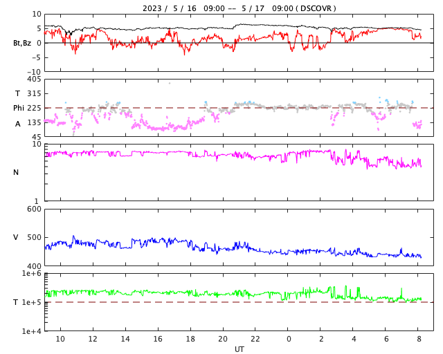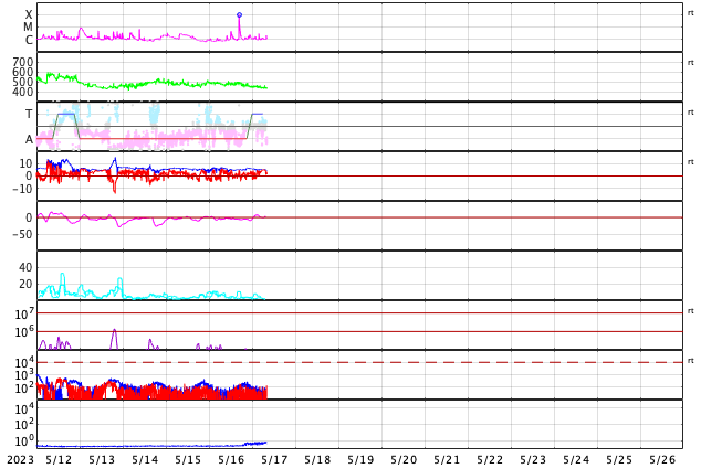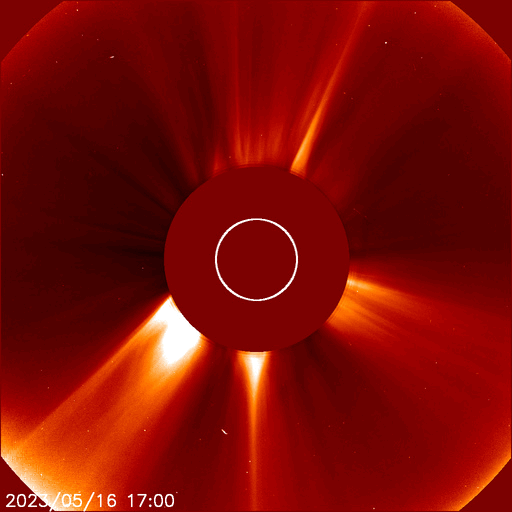 2023/ 5/17 17:24 更新 M9.6の中規模フレアが発生しました。太陽風は平均的な状態です。 担当 篠原 今週も更新時間が遅くなり申し訳ありません。 水曜日はもうしばらくこの状態になりそうです。 太陽で大きい活動が起きています。 今日未明、17日1時半(世界時16日16時半)に、 南東の端(左下)の少し向こう側で M9.6とXクラス直前の中規模フレアが発生しました。 SDO衛星AIA131の動画を掲載します。 フレアの一部しか見えていないので、 実際にはXクラスに達する規模だったのかもしれません。 可視光写真では、ちょうど黒点が見え始めたところです。 今後も活動が続くのか注目してください。 また、SOHO衛星LASCO C2、C3では、 M9.6フレアと同じ頃、17日2時(世界時16日17時)に、 太陽の右に向かって激しく噴き出すCME(コロナ質量放出)が 観測されています。 太陽の向こう側で発生した現象なので、 地球への影響はありません。 数日前に西の端に沈んで行った活動的な領域で 発生したのでしょうか。 太陽風は、速度が480km/秒から440km/秒へ下がり、 平均的な状態に戻っています。 磁場強度は、5nTと平均的な状態で安定しています。 磁場の南北成分は、0nT付近か北寄りで、 磁気圏は穏やかに推移しています。 AE指数は小さい変化が見られる程度です。 SDO衛星AIA193では、 太陽の南東側にコロナホールが見えている様です。 この領域が中心線を過ぎるまでは、 太陽風は穏やかに推移しそうです。