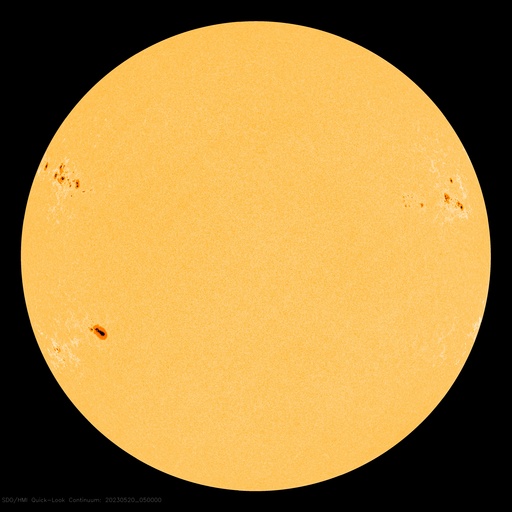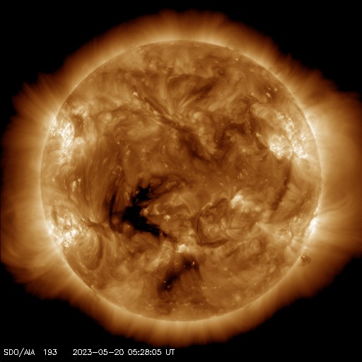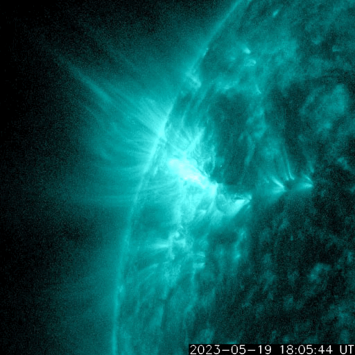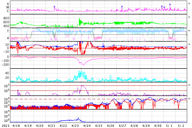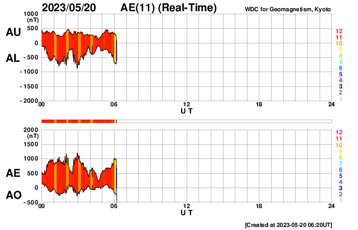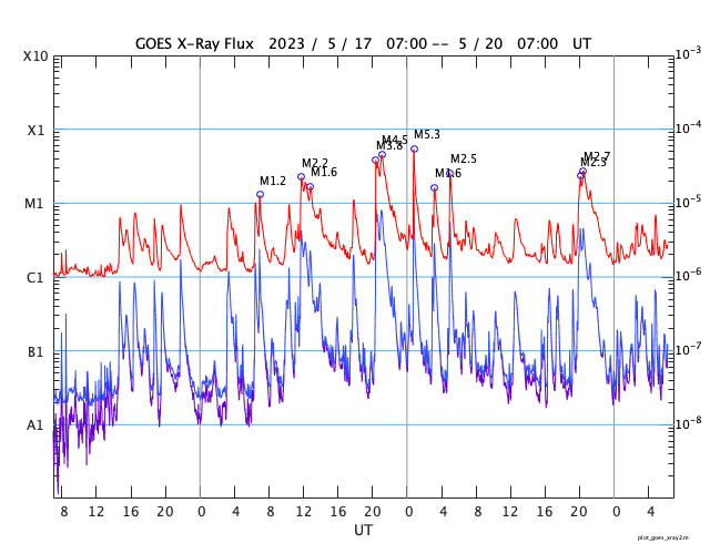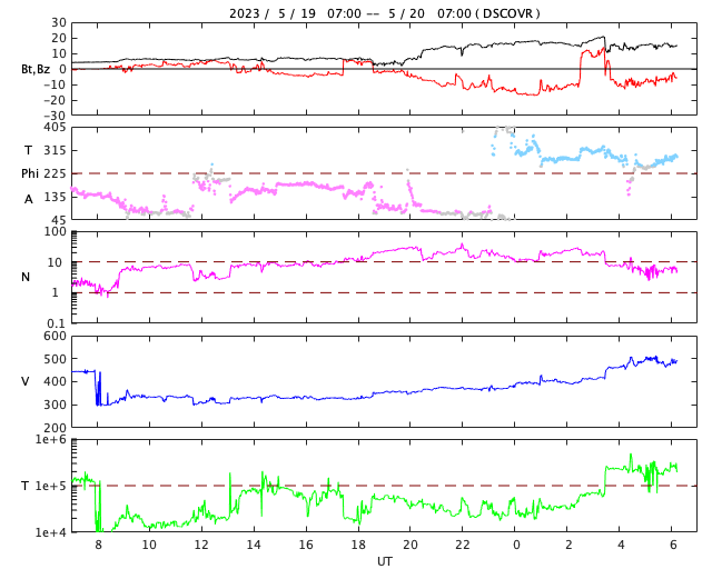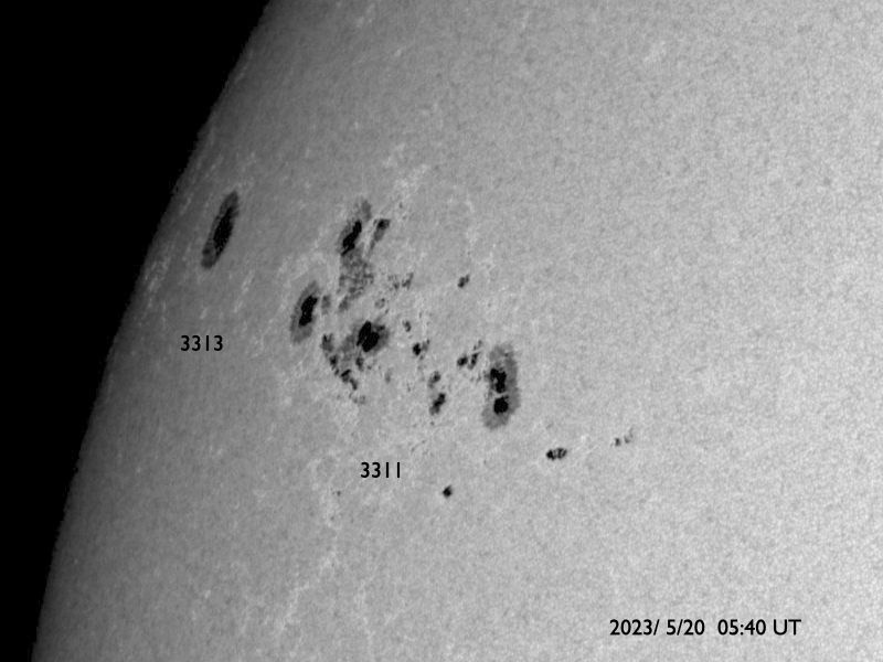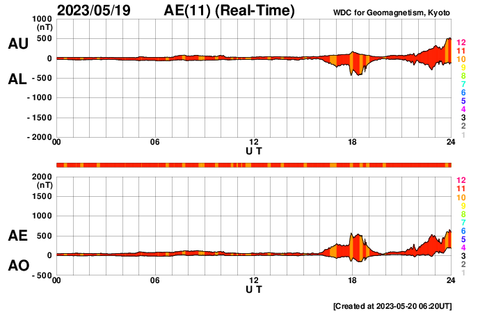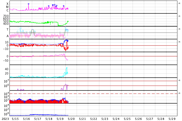 2023/ 5/20 15:27 更新 M2.3、M2.7の中規模フレアが発生しました。太陽風磁場の強まりが到来しています。 担当 篠原 太陽の3311黒点群の活動が続いています。 昨日のニュースの直後にM2.5の中規模フレアを起こした後も、 C3〜6程度の小規模フレアが頻繁に発生し、 今朝、20日5時(世界時19日20時)には、 M2.3、M2.7の中規模フレアが連続して起きました。 SDO衛星AIA131の動画と、 3311群の可視光写真を掲載します。 今回のフレアでも、 SOHO衛星LASCO C2で目立つ規模の CME(コロナ質量放出)は発生していないようです。 引き続き、3311群の活動に注目して下さい。 太陽風は、今朝、20日5時半(世界時19日20時半)から 磁場強度が強まり、 7nTと平均的な状態から、初めに12nT、 その後17nT程度の強まりになっています。 CMEによって太陽風磁場の強まりが運ばれてきたのでしょうか。 太陽風の速度は、340km/秒の低速の状態から、 グラフの最後は480km/秒とやや高速になっています。 磁場の南北成分は、磁場の強まりと共に南向きに強まり、 -10nTに達する変化がしばらく続いています。 この頃の太陽風の速度は平均的な状態で、 AE指数は1000nTに達する大規模な変化がしばらく続いています。 SDO衛星AIA193では、南側にコロナホールが見えています。 3日後くらいからこれらの領域の影響で、 太陽風の速度が高まるかもしれません。 ![]() 3311黒点群で発生した、M2.3、M2.7の中規模フレア。 (c) SDO衛星AIA131 (NASA)、(動画加工 : 宇宙天気ニュース) ![]() 3311黒点群の拡大写真。 (c) SDO衛星AIA131 (NASA)、作図:宇宙天気ニュース ![]() SDO衛星のAIA193カメラによる太陽コロナの様子 (c) SDO (NASA) ![]() SDO衛星による太陽の可視光写真。マウスの矢印を写真に重ねると、黒点番号付きの写真に切り替わります。 (c) SDO (NASA) ![]() GOES衛星の太陽X線強度。赤・橙 = 0.1〜0.8 nm、青・紫 = 0.05〜0.4 nm (c) データ:NOAA/SWPC、作図:宇宙天気ニュース ![]() DSCOVRが観測した太陽風の磁場(黒線は全体の強度、赤線は南北成分) 磁場の向き、プラズマの密度、速度、温度 (c) データ:NOAA/SWPC、作図:宇宙天気ニュース ![]() AE指数(速報値) 下段のAEグラフの値が高くなると、オーロラ活動が活発化しています。 (c) 京都大学WDC ![]() ![]() 27日の太陽周期に合わせた図 太陽が同じ面を地球に向けていた27日前の変化から、今後を予想することができます。 (c) 作図:宇宙天気ニュース