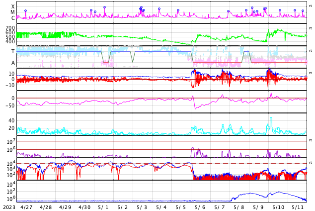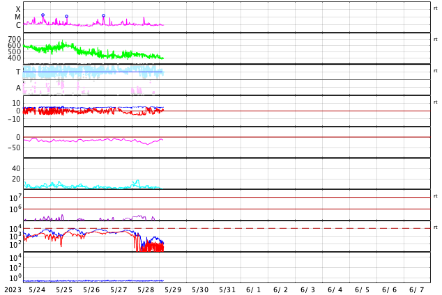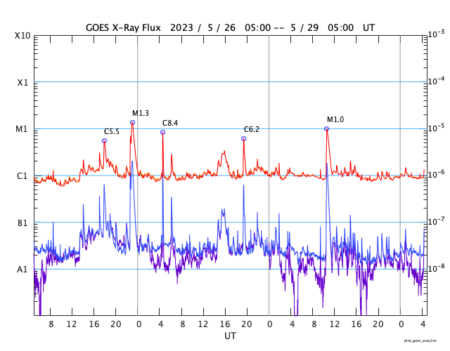 GOES衛星の太陽X線強度。赤・橙 = 0.1〜0.8 nm、青・紫 = 0.05〜0.4 nm (c) データ:NOAA/SWPC、作図:宇宙天気ニュース ![]() | ||||||||||||||||||||||||||||||||||||||||||||||||||||||||||||||||||||||||||||||||||||||||||||||||||||||||||||||||||||||||||||||||||||||||||||||||||||||||||||||||||||||||||||||||||||||||||||||||||||||||||||||||||||||||||||||||||||||||||||||||||||||||