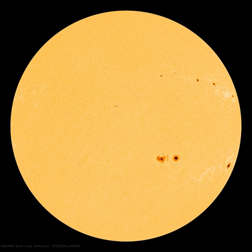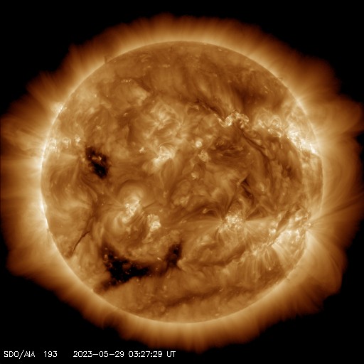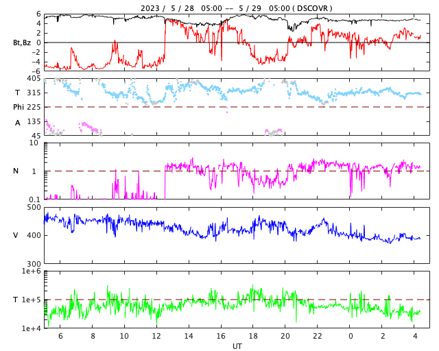 2023/ 5/29 13:35 更新 太陽風は次第に低速になっています。磁気圏は穏やかになっています。 担当 篠原 太陽風の速度は、450km/秒から390km/秒へ下がり、 次第に低速になってきました。 磁場強度は、4〜5nTと平均的な状態です。 磁場の南北成分は、 昨日のニュースの後も夜にかけて南向きの変化が続き、 28日21時半(世界時28日12時半)に、 急に北向きに切り替わっています。 AE指数を見ると、 グラフの初めから続いていた500nT前議の変化は、 太陽風磁場の変化の1時間後くらいに急に小さくなっています。 磁場の向きが北向きに切り替わったため、 磁気圏へのエネルギーの流れ込みが 小さくなったことを示しています。 SDO衛星AIA193の太陽コロナ写真では、 南東側(左下)にコロナホールが見えています。 3日後くらいから、 この領域の影響で太陽風の速度が高まるかもしれません。 太陽では、昨夜、28日29時半(世界時28日10時半)に、 南西側(右下)の3315黒点群で M1.0の中規模フレアが発生しています。 X線強度のグラフでは、目立つ変化はこれくらいで、 その他はC1くらいの小さい小規模フレアが発生している程度です。 黒点群も西側に偏っていて、 東側の太陽面は寂しくなっています。 東端に小さい黒点が現れていますが、 これに続く領域はあるでしょうか。 ![]() SDO衛星のAIA193カメラによる太陽コロナの様子 (c) SDO (NASA) ![]() SDO衛星による太陽の可視光写真。マウスの矢印を写真に重ねると、黒点番号付きの写真に切り替わります。 (c) SDO (NASA) ![]() DSCOVRが観測した太陽風の磁場(黒線は全体の強度、赤線は南北成分) 磁場の向き、プラズマの密度、速度、温度 (c) データ:NOAA/SWPC、作図:宇宙天気ニュース ![]() AE指数(速報値) 下段のAEグラフの値が高くなると、オーロラ活動が活発化しています。 (c) 京都大学WDC ![]() ![]() 27日の太陽周期に合わせた図 太陽が同じ面を地球に向けていた27日前の変化から、今後を予想することができます。 (c) 作図:宇宙天気ニュース