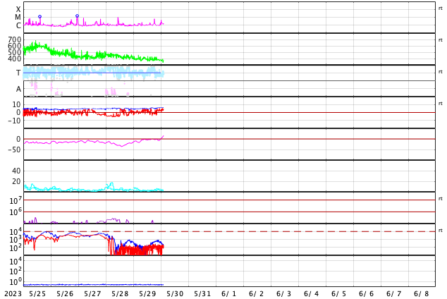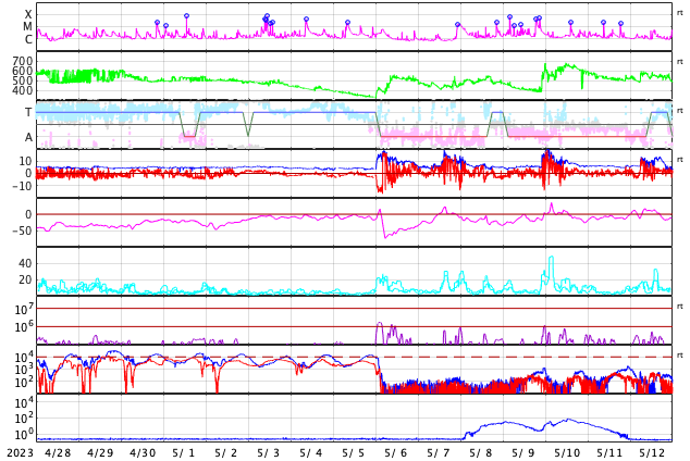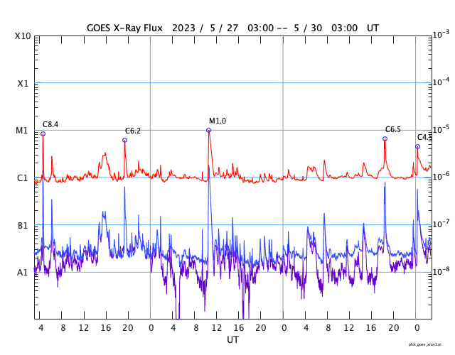 GOES衛星の太陽X線強度。赤・橙 = 0.1〜0.8 nm、青・紫 = 0.05〜0.4 nm (c) データ:NOAA/SWPC、作図:宇宙天気ニュース ![]() | ||||||||||||||||||||||||||||||||||||||||||||||||||||||||||||||||||||||||||||||||||||||||||||||||||||||||||||||||||||||||||||||||||||||||||||||||||||||||||||||||||||||||||||||||||||||||||||||||||||||||||||||||||||||||||||||||||||||||||||||||||||||||||||||