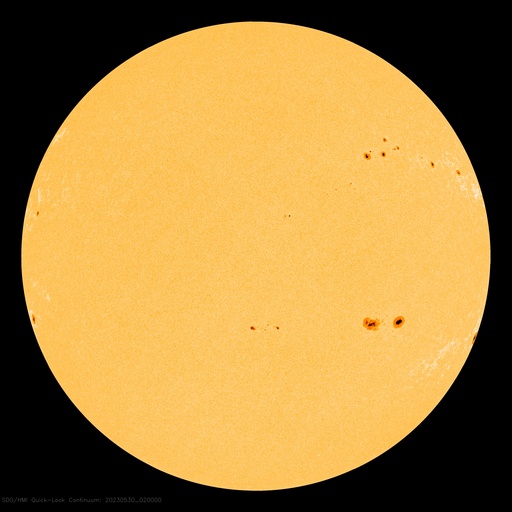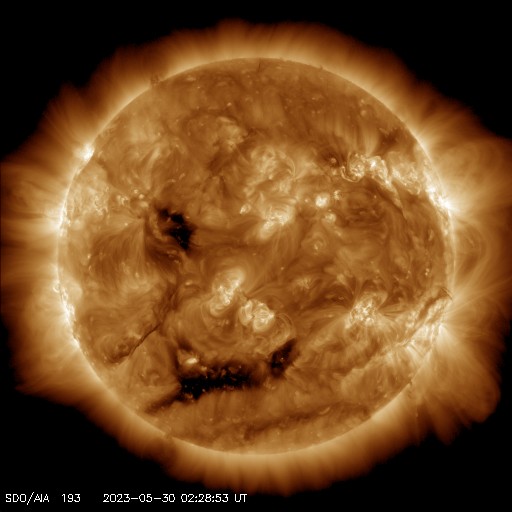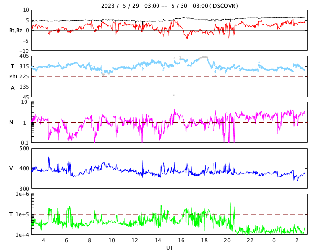 2023/ 5/30 12:01 更新 太陽風はやや低速になり、磁気圏は穏やかな状態です。 担当 篠原 太陽風は、380km/秒とやや低速の状態で推移しています。 磁場強度は、5nTから6nTへ少し上がっていますが、 平均的な状態です。 磁場の南北成分は、比較的北寄りの状態です。 このため磁気圏は穏やかで、 オーロラの活動度を示すAE指数のグラフは、 ほとんど変化のない状態です。 SDO衛星AIA193の太陽コロナ写真では、 中心部の南側にコロナホールが見えています。 少し緯度が高めですが、 2〜3日後から太陽風の速度が高まる可能性があります。 また、中心部東側(左側)の赤道付近にも 小さいコロナホールが見えています。 太陽は、南西(右下)の3315黒点群でC6.5、 南西の端の3310群でC4.5の小規模フレアが発生していますが、 全体としては比較的穏やかな印象です。 東端(左端)の南北それぞれに黒点が現れています。 この周辺では、小さい活動が度々発生しています。 この後どの様な推移になるでしょうか。 ![]() SDO衛星のAIA193カメラによる太陽コロナの様子 (c) SDO (NASA) ![]() SDO衛星による太陽の可視光写真。マウスの矢印を写真に重ねると、黒点番号付きの写真に切り替わります。 (c) SDO (NASA) ![]() DSCOVRが観測した太陽風の磁場(黒線は全体の強度、赤線は南北成分) 磁場の向き、プラズマの密度、速度、温度 (c) データ:NOAA/SWPC、作図:宇宙天気ニュース ![]() AE指数(速報値) 下段のAEグラフの値が高くなると、オーロラ活動が活発化しています。 (c) 京都大学WDC ![]() ![]() 27日の太陽周期に合わせた図 太陽が同じ面を地球に向けていた27日前の変化から、今後を予想することができます。 (c) 作図:宇宙天気ニュース