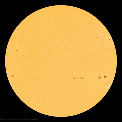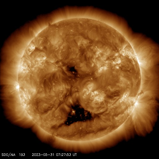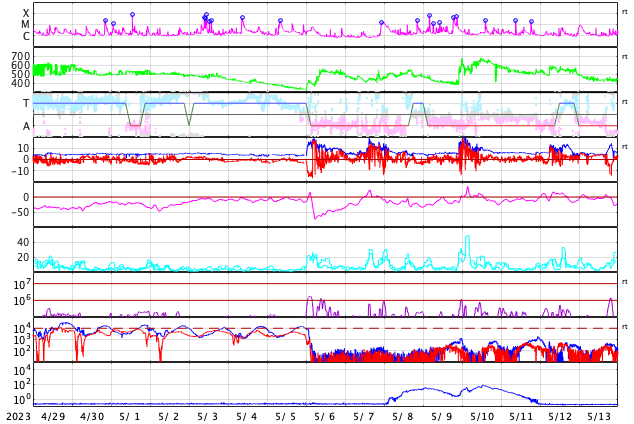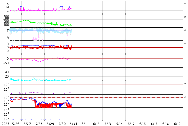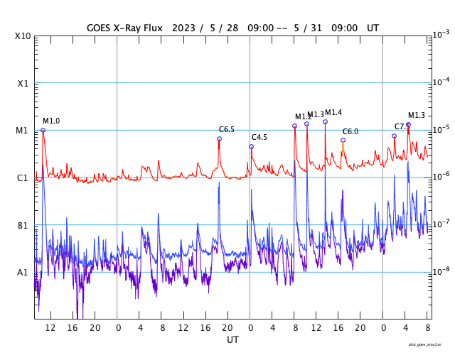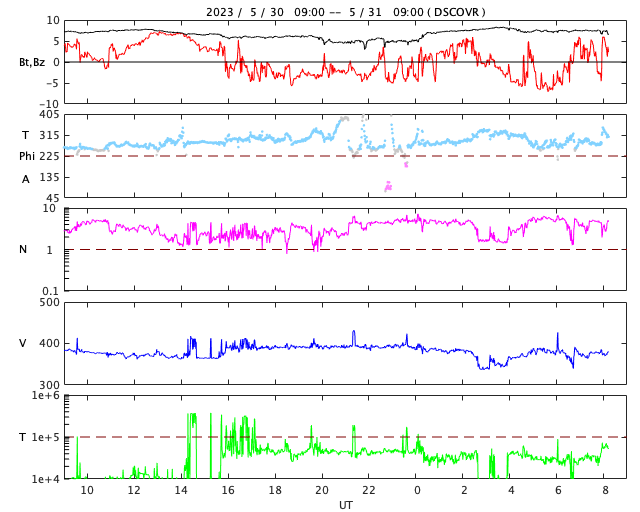 2023/ 5/31 17:24 更新 太陽の東端でフレアが発生しています。太陽風は低速です。 担当 篠原 昨日の夕方から夜遅くにかけて、 太陽の南西(右下)の3310群と3315群で、 M1.2、M1.3、M1.4と中規模フレアが発生しました。 順番に規模が大きくなっていて面白いです。 今朝からは、東端(左端)でフレアが見られる様になり、 M1.3の中規模フレアと、 C7.5、C5.7などの小規模フレアが度々発生しています。 可視光写真では、ちょうど黒点が見え始めています。 この領域では今後も活動が続くでしょうか。 注目してください。 太陽風は、速度が360〜380km/秒と低速で推移しています。 磁場強度は、7nT前後と少し上がっています。 磁場の南北成分はやや南寄りですが、 速度が下がっているため磁気圏は概ね静穏で、 AE指数は、小規模の変化が起きている程度です。 SDO衛星AIA193では、 南側のコロナホールが西に進み、 影響が始まる目安の位置に近付いています。 明日以降、太陽風速度の高まりはやって来るでしょうか。 今週も更新が夕方になってしまいました。 水曜日は、まだしばらくこの時間帯になりそうです。