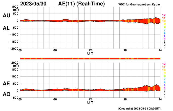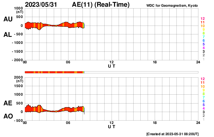 (c) SDO (NASA) ![]() SDO衛星による太陽の可視光写真。マウスの矢印を写真に重ねると、黒点番号付きの写真に切り替わります。 (c) SDO (NASA) ![]() GOES衛星の太陽X線強度。赤・橙 = 0.1〜0.8 nm、青・紫 = 0.05〜0.4 nm (c) データ:NOAA/SWPC、作図:宇宙天気ニュース ![]() DSCOVRが観測した太陽風の磁場(黒線は全体の強度、赤線は南北成分) 磁場の向き、プラズマの密度、速度、温度 (c) データ:NOAA/SWPC、作図:宇宙天気ニュース ![]() AE指数(速報値) 下段のAEグラフの値が高くなると、オーロラ活動が活発化しています。 (c) 京都大学WDC ![]() ![]() 27日の太陽周期に合わせた図 太陽が同じ面を地球に向けていた27日前の変化から、今後を予想することができます。 (c) 作図:宇宙天気ニュース
