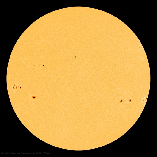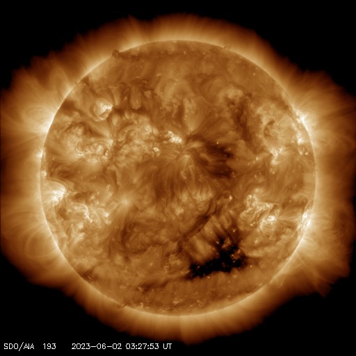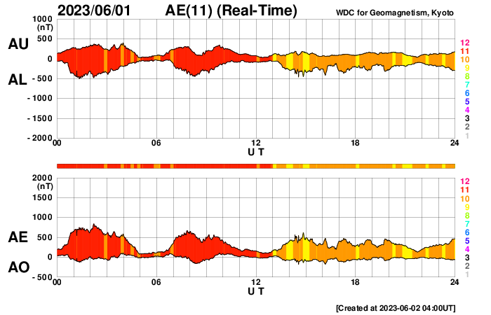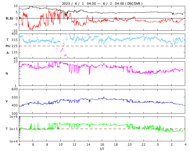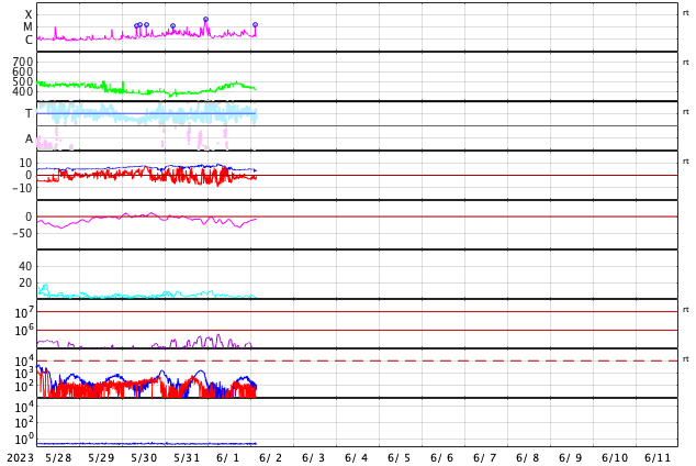 2023/ 6/ 2 13:03 更新 太陽風の小さい強まりが到来しました。太陽の中心部でM1.5フレアが発生しています。 担当 篠原 太陽風の速度は、昨日の午後から夜にかけて、 400km/秒から480km/秒へ少し高まる変化が発生しています。 今朝からはゆっくりと下がって、 現在は400km/秒と平均的な状態に戻っています。 磁場強度は、グラフの最初で10nT近い強まりになっていますが、 その後は下がって、5nTと平均的な状態が続いています。 磁場の南北成分は、磁場が強まった頃に南向きに強まり、 以降も変化は小さくなっていますが、 南寄りの傾向が続いています。 磁気圏はやや活動的な状態になっていて、 AE指数は500nT程度の変化が連続的に発生しています。 SDO衛星AIA193では、 コロナホールが南西側(右下)に見えています。 現在の太陽風は平均的な状態ですが、 この後、コロナホールの影響がやって来るでしょうか。 注目してください。 昨日のM4.2のフレア以降、 3323黒点群は変化が少なくなり、 今朝にC6.2の小規模フレアを起こした程度です。 一方、中心部の北側に小さい黒点が新しく現れ、 頻繁に小さいフレアを起こすようになっています。 先ほど、2日11時半(世界時2日2時半)に M1.5の中規模フレアを起こしました。 この後も活動に注目してください。 今日未明に学校の地域で停電が発生して、 その影響で学内LANが止まってしまい、 半日ほど宇宙天気ニュースが停止してしまいました。 台風による風雨の強まりはありませんでしたので、 関係ない停電の様です。